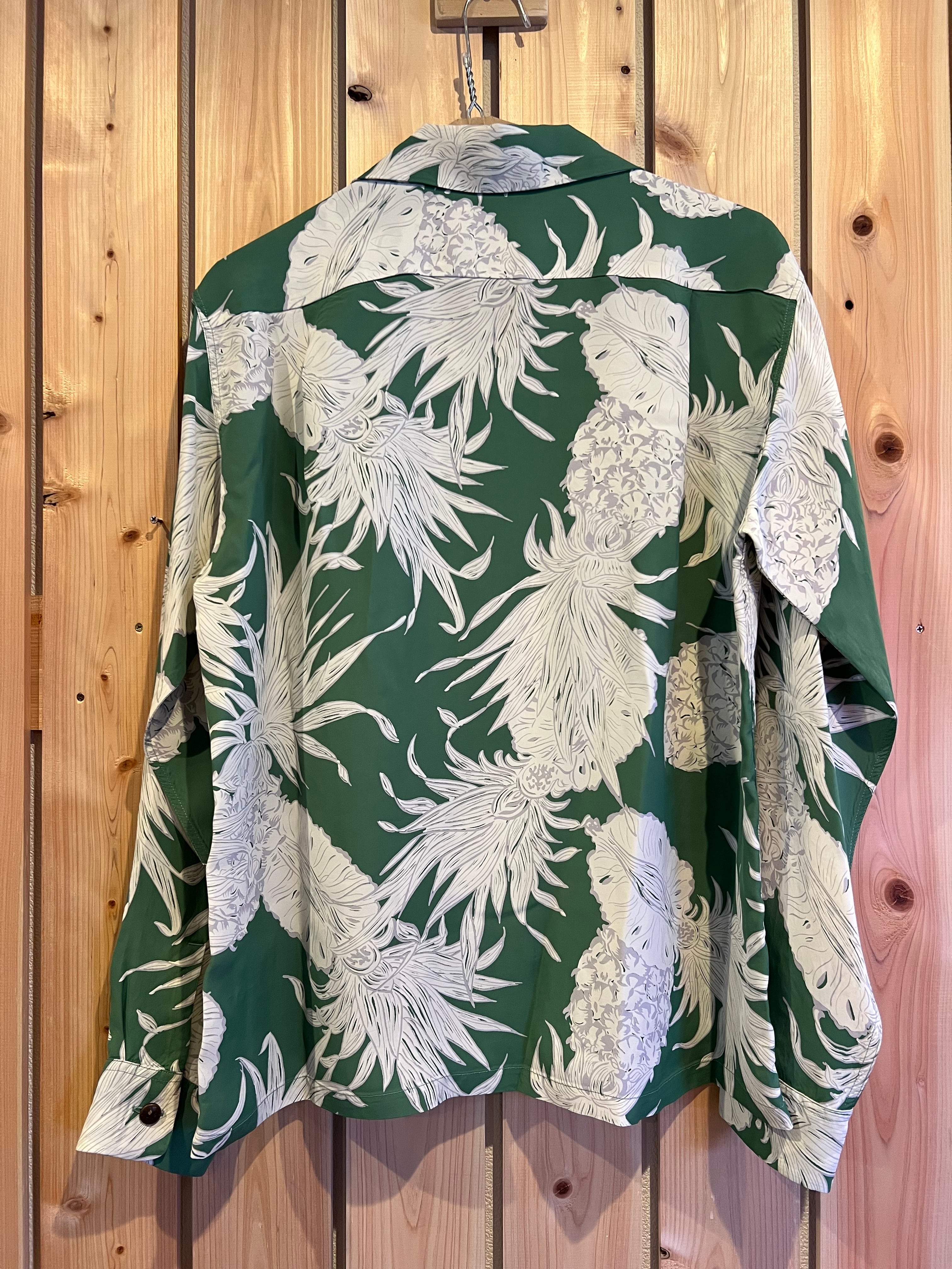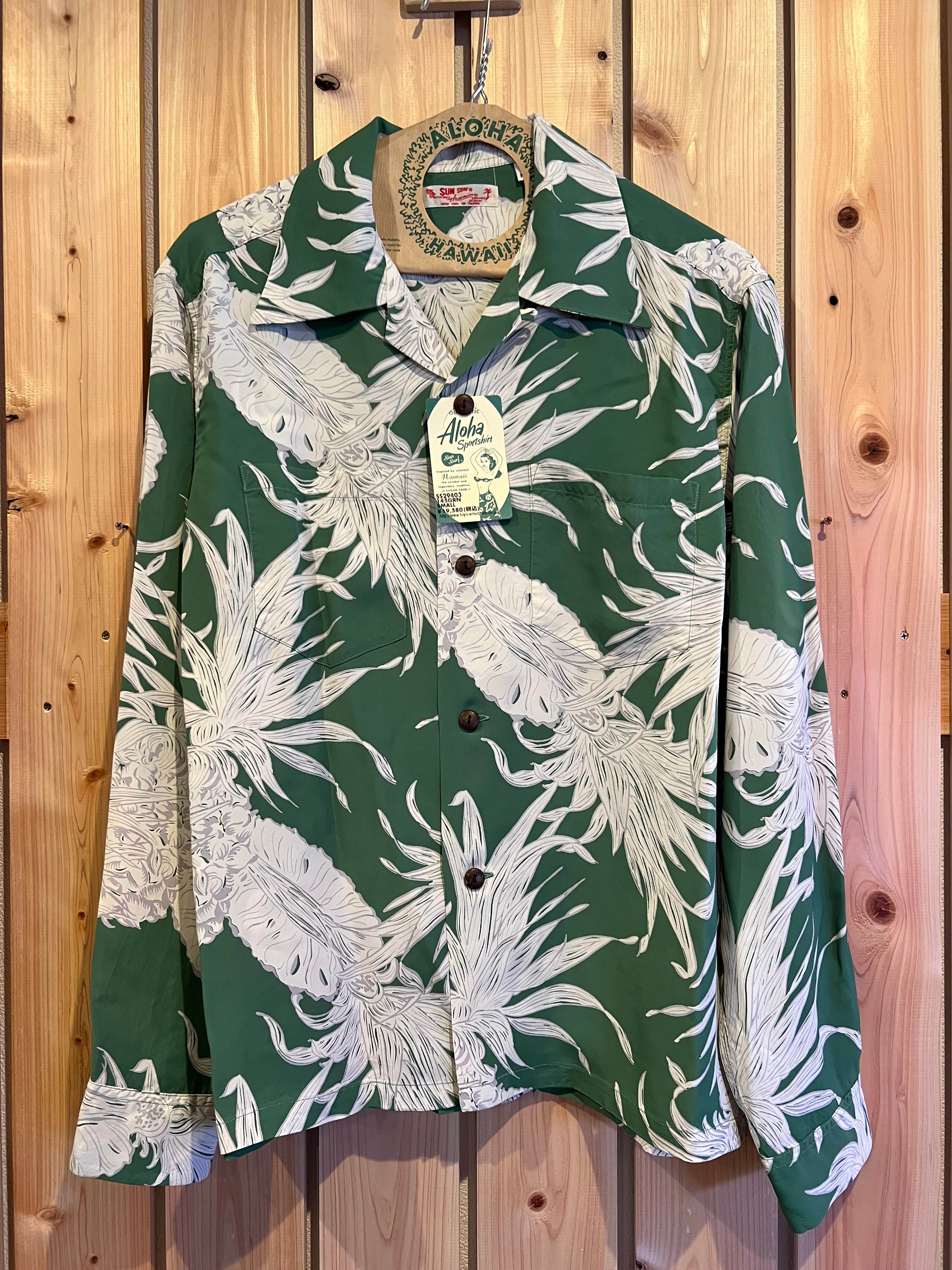 主にアメリカ本土からの観光客で賑わいを見せていた当時のハワイで、アロハシャツはギフトアイテムとして不動の地位を確率していた。シャツのデザインに使われていたモテーフの中でも定番的な人気を誇り、種類も多いのがハワイの象徴とも言うべきパイナップル。なかでも最も優れたデザインと言われ、コレクターからの人気も絶えない作品が、このアイランド・パイナッブル。手がけたのはアロハシャツ史に名を残すテキスタイル・デザイナー、ジョン・メイグス。