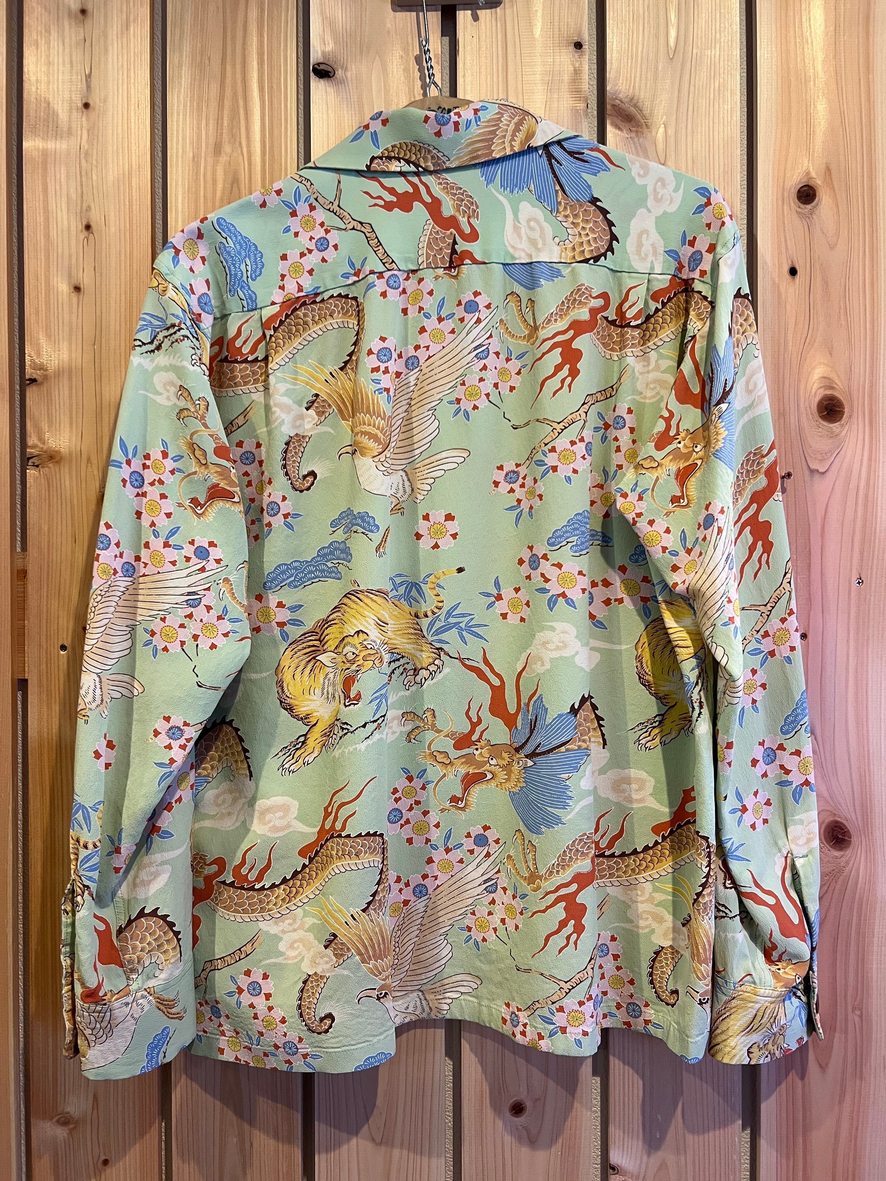 スーベニアジャケット(スカジャン)を象徴する刺繍として定番となっている鷲・虎・龍のモチーフ。日本に駐留していた兵士たちがこぞって刺繍入りのスーベニアジャケットをオーダーしていた1950年に、 同じく全盛期を迎えたアロハシャツ。それらにも同様に日本を象徴するデザインが取り入れられ、人気を博した。特徴ある和柄を多く送り出したホオカノ・スポーツウエア社の作品で、これこそまさに「和の洋服 」を代表する一枚。