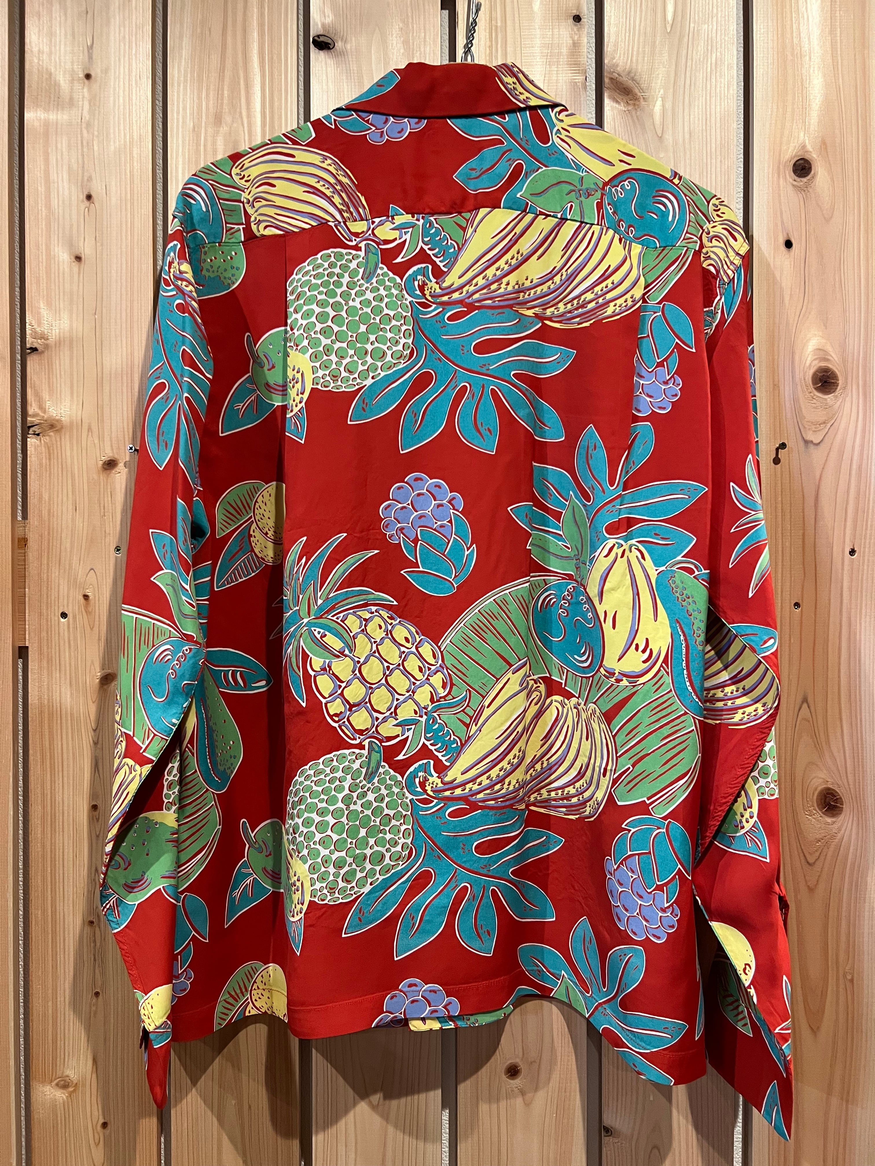 グアバ、リリコイ(パッションフルーツ)、パパイヤ、ブレッドフルーツ、パイナップルといったハワイを代表するフルーツだけで構成されたアロハシャツらしい一枚。