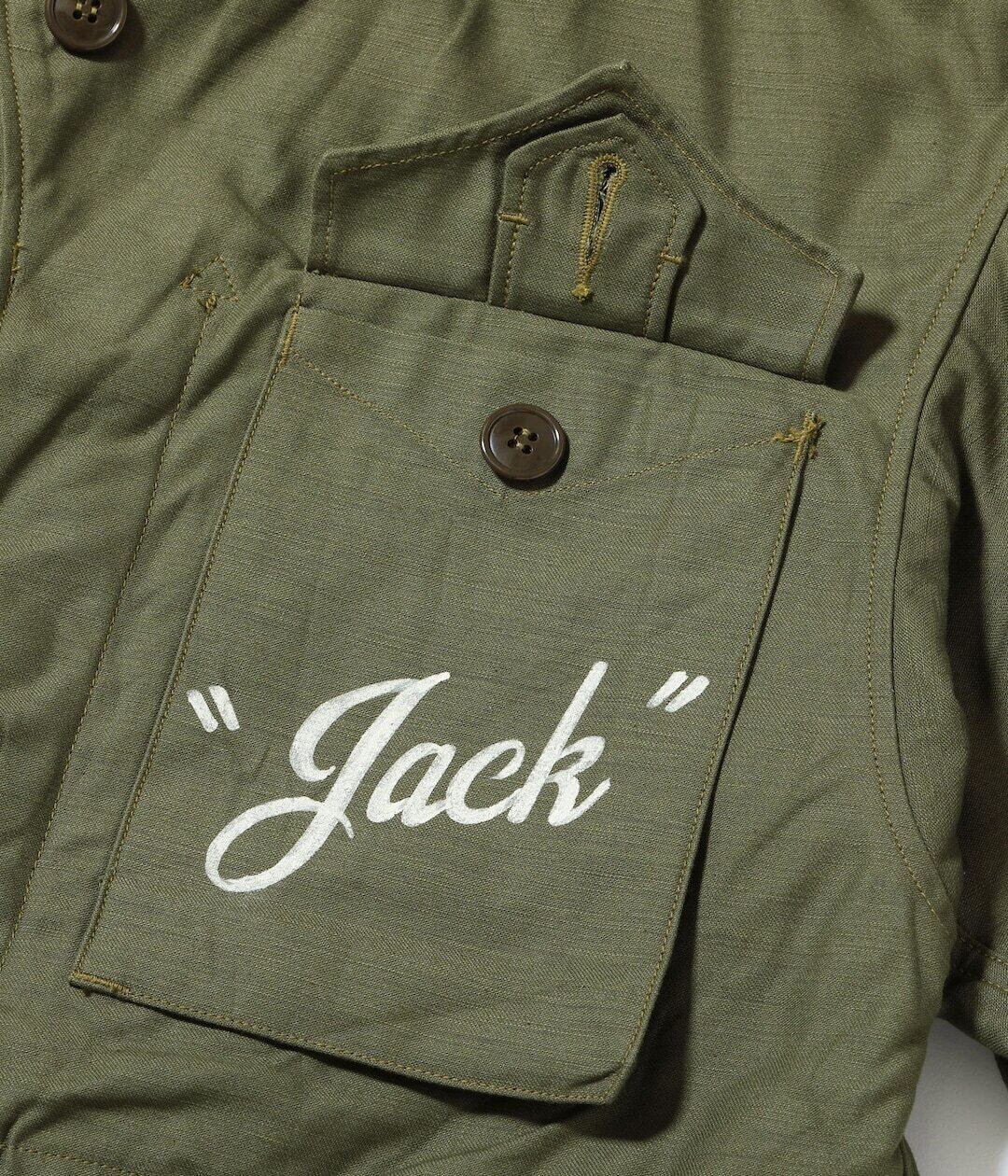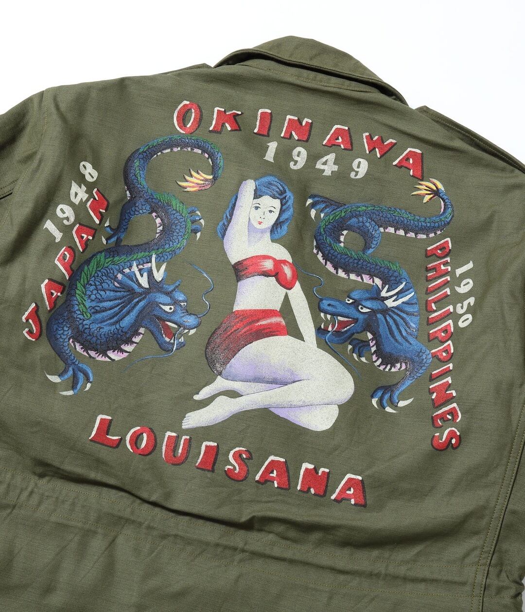 第二次大戦中、米軍によってWar Art (ウォー・アート)が開花した。兵士たちが着用する戦闘服の背中をキャンバスに見立て、絵心のある兵士が筆と塗料を手にして 思い思いに絵を描いた。これがバックペイントの始まりである。その内容は戦闘で使用する愛機と出撃スコア、故郷に残してきた彼女、兵舎に送られてくる娯楽雑誌の ピンナップガールを模写したものなど、着用者自身の意志やプライドを映し出しているため同じ柄は少なく、個性的でオリジナル性の高いものが多い。アジア圏に駐留した米兵たちは、これまで経験したことのない神秘的な文化に触れると早速ジャケットにそのアジアンテイストを取り入れて自身の戦闘服をカスタムアップさせた。このジャケットの背面に描かれているのは故郷に残した彼女だろうか。アジアに伝わる神話・伝説の生物であるドラゴンまでもが高揚する絶世の美女だったという兵士の強い思 い入れと美学がこの一着には込められているのだ。