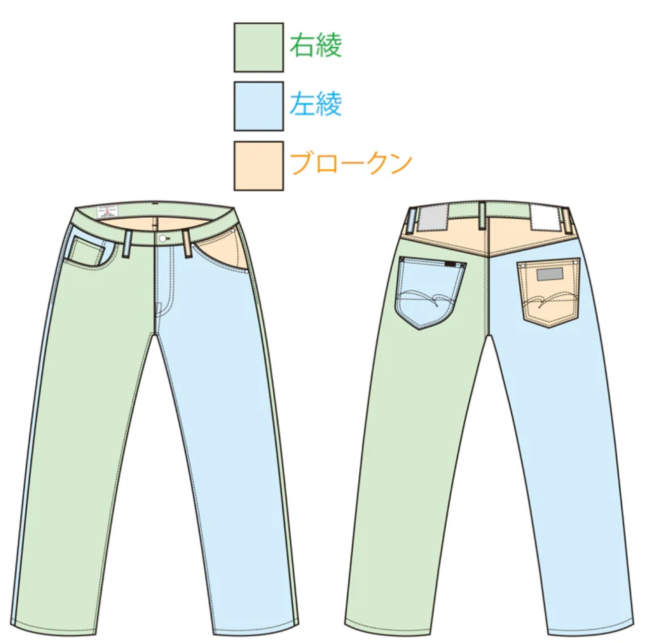 それぞれ異なるコンセプトで織られたデニム生地の色落ちを1本で楽しむことができるジーンズです。