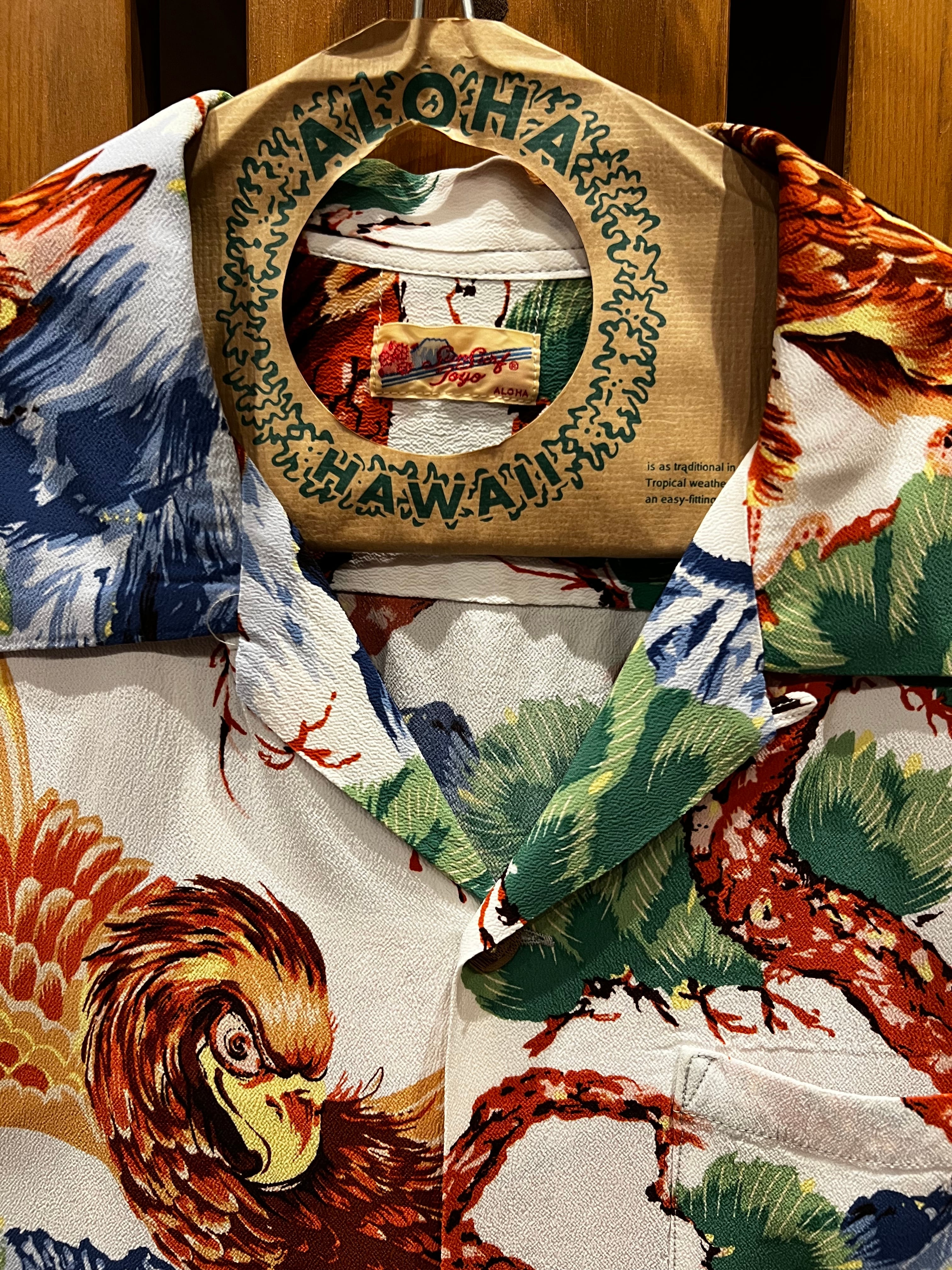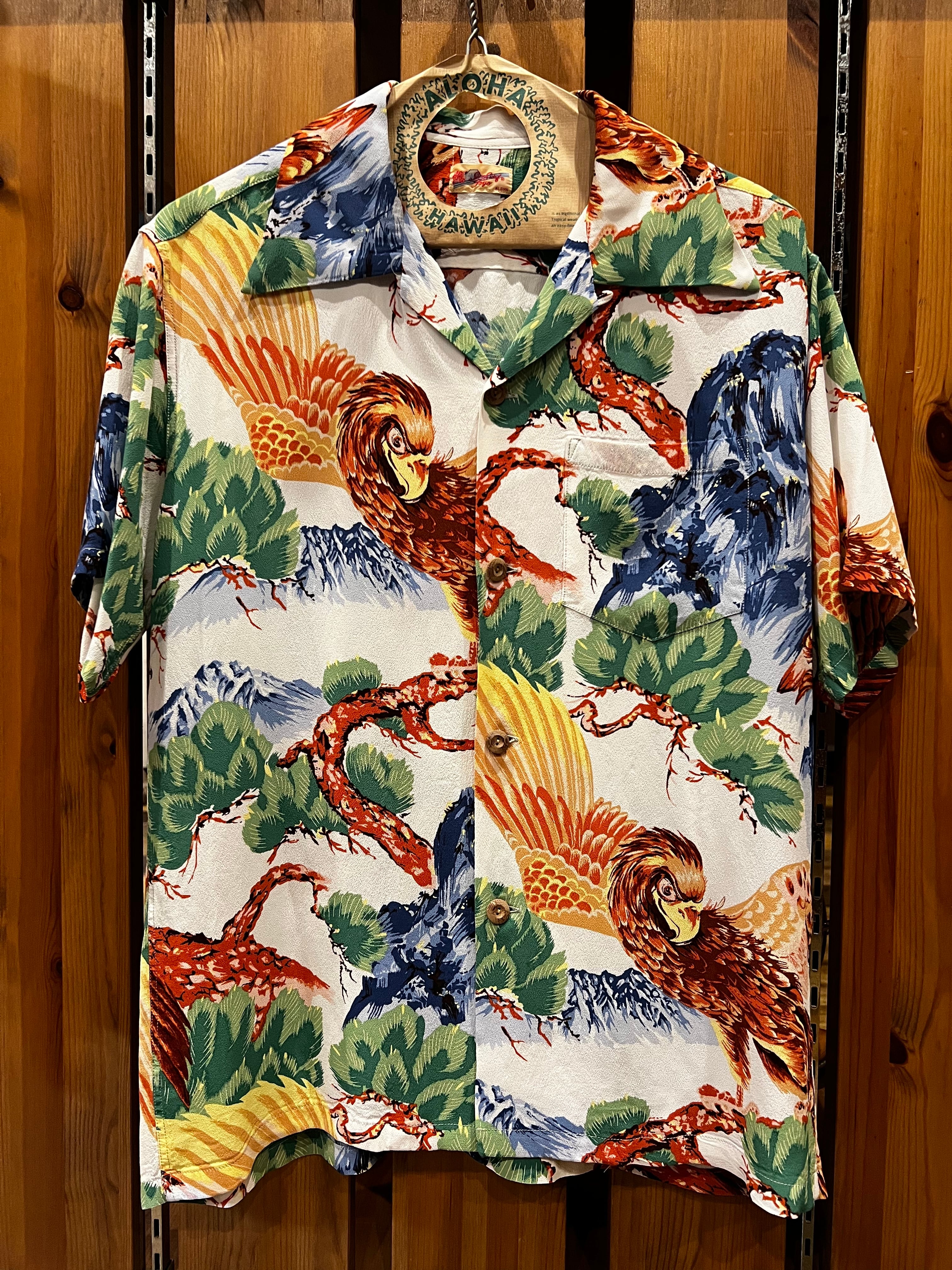 ハワイの日系人に愛された和柄のアロハシャツ。アメリカ本土で巻き起こったオリエンタルブームも相まって、その人気はハワイを訪れた観光客にも猛烈な高まりを見せた。特にアメリカ合衆国の象徴である鷲をモチーフとしたデザインは注目を浴び、多くのブランドが展開。獲物をみつけ飛び立とうとする鷲の躍動感が伝わってくるこの作品は、ʼ50年代後期にポリネシアン・スポーツウェア社が手掛けた一枚。