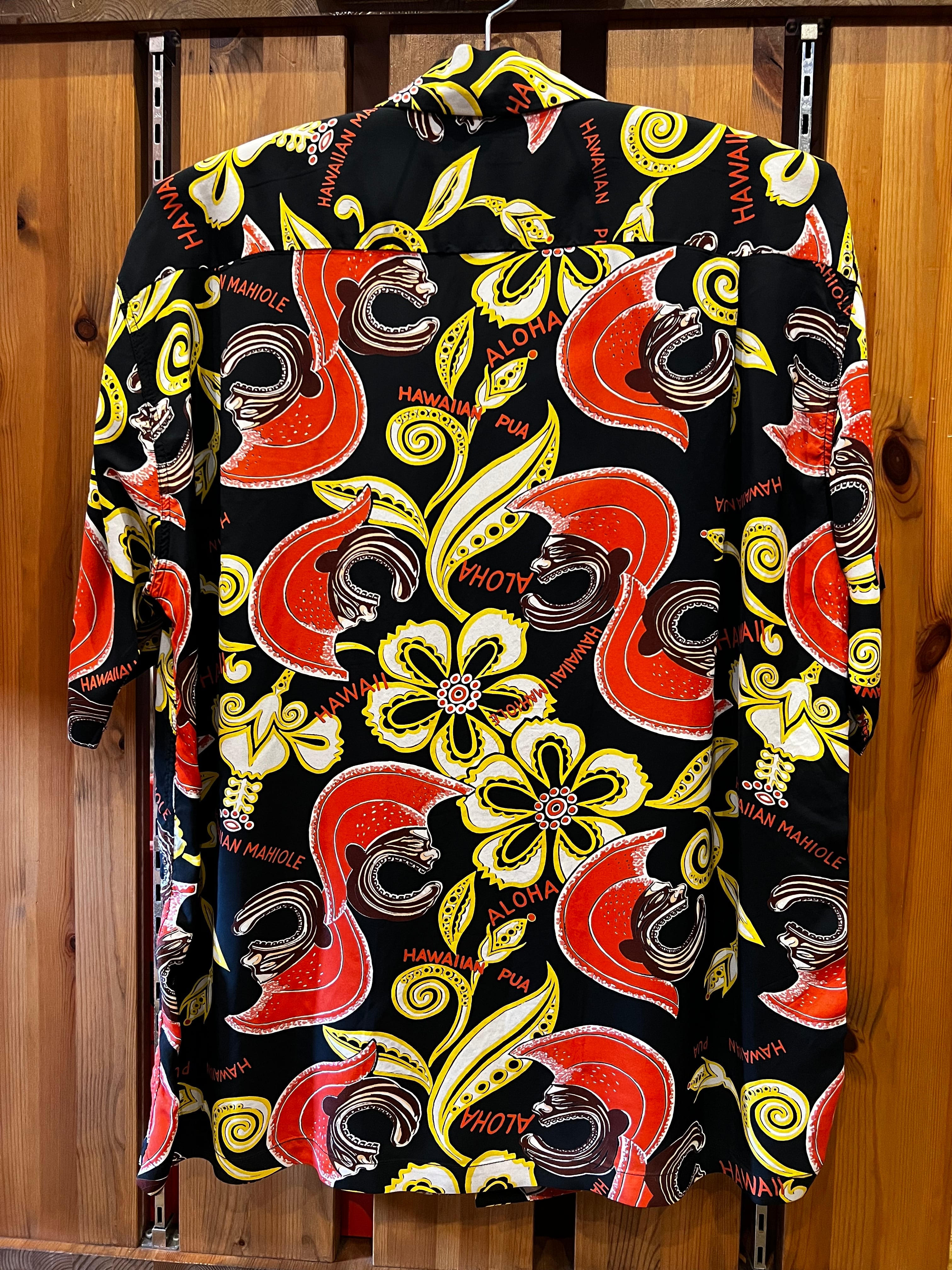 商品説明/ハワイの植物を図案化し、ネイティブ・ハワイアンの戦士が儀式で着用する兜「マヒオレ」と共に描いた1枚。