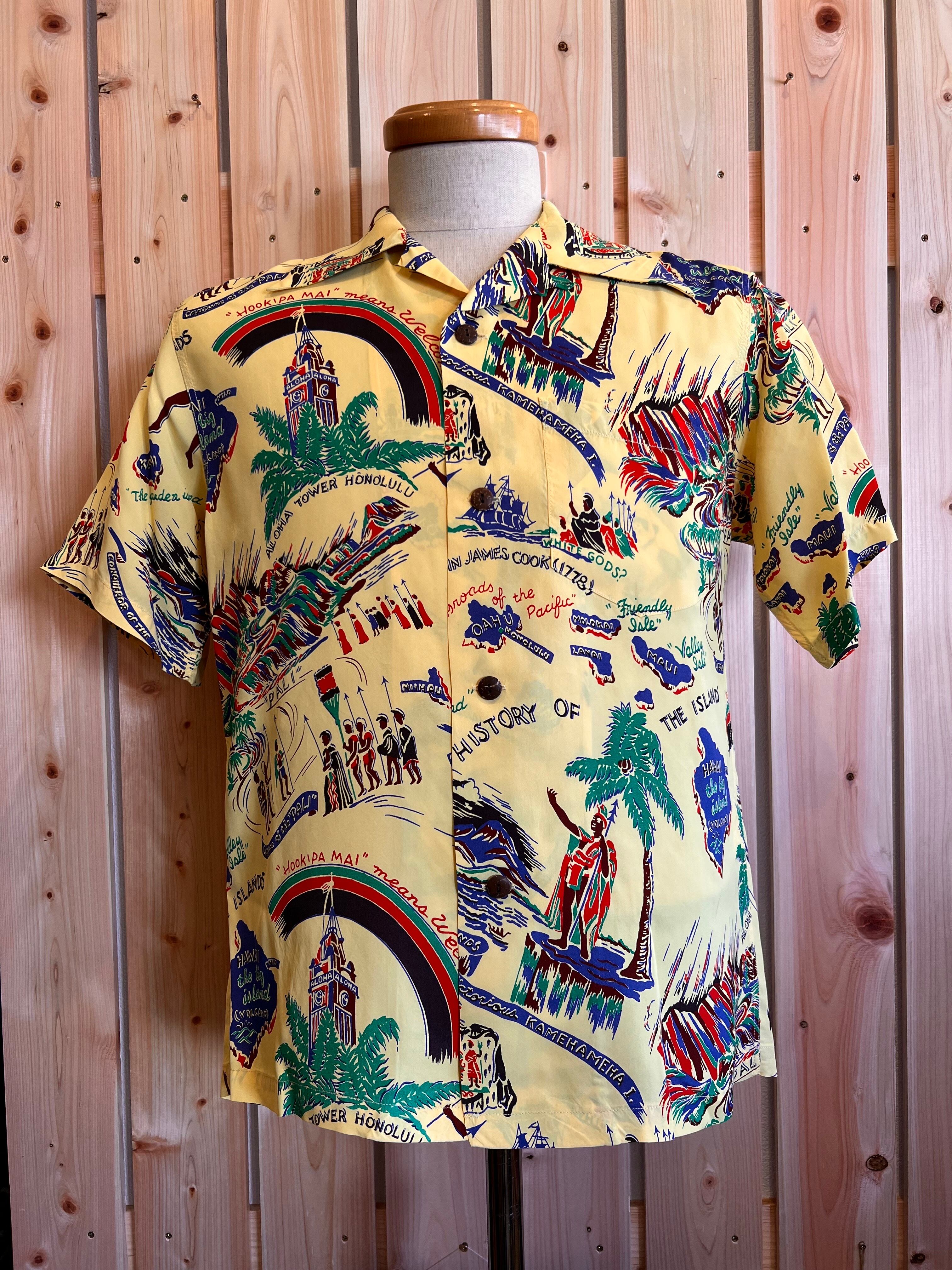 モチーフの配置や大きさなど、計算し尽くされた構成で強烈なインパクトを放つ1940年代後期の作品。ハワイで1944年に創業した老舗スポーツウェアメーカー「ラウハラ」社が手掛けたヴィンテージをもとに復刻した。虹の架かったアロハタワーをメインモチーフとし、ハワイの島々、カメハメハ大王やハワイアン・クレスト(王家の紋章)などの定番的なモチーフに加え、1778年にハワイを訪れたキャプテン・ジェームズ・クックなど歴史的な出来事も描かれている。コレクタブルな要素が満載なこのデザインは知名度も高く、いくつものヴィンテージアロハシャツの書籍で紹介されてきた名作。