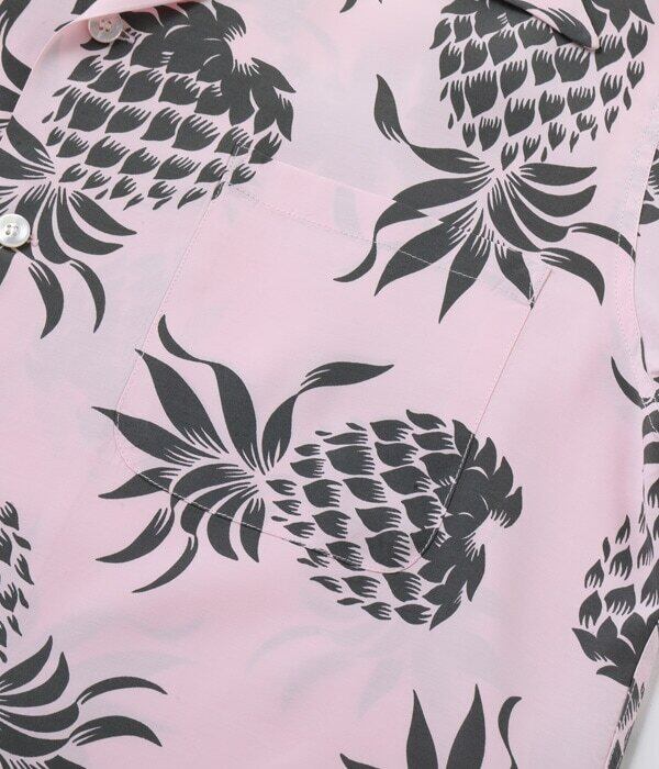 数あるヴィンテージアロハシャツの中でも非常に人気の高いパイナップルのデザイン。1953 年の映画「地上より永遠に」の劇中で着用され、一躍人気を博したアロハシャツ史上最も有名なパイナップル柄が、この「デュークス・パイナップル」である。当時のロングセラーで多くのカラーバリエーションが存在し、今季は再販のリクエストの多いクリームとブルーを含めた3色展開。