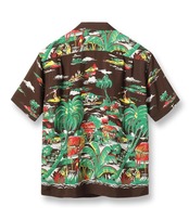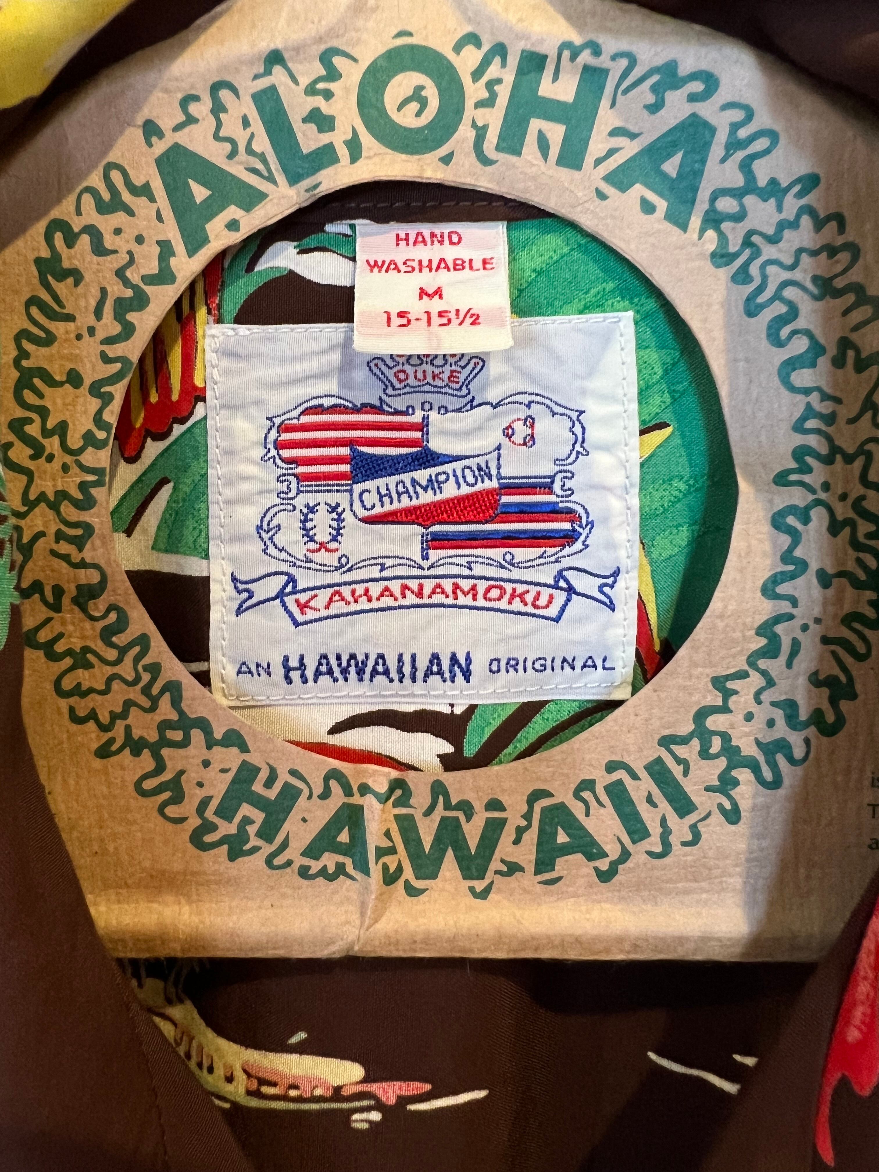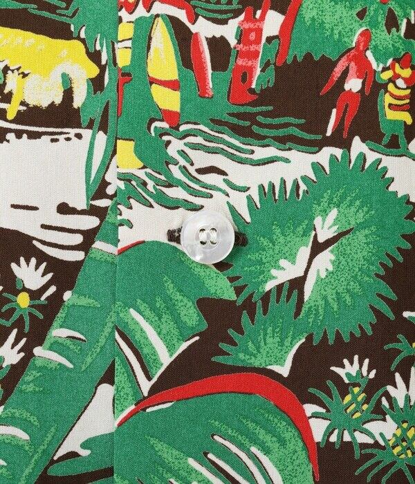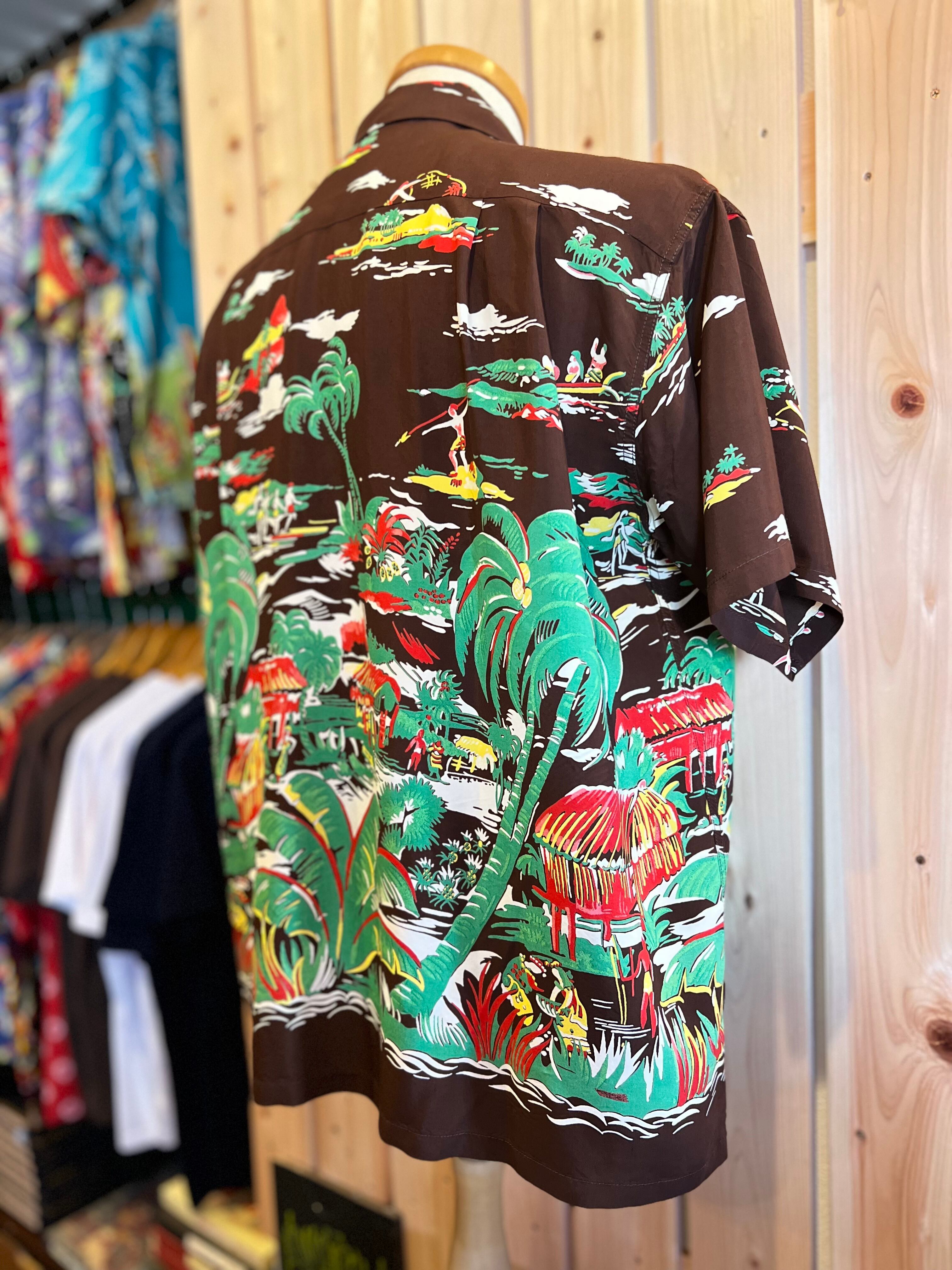 デューク・ブランドの代名詞ともいうべきレーヨンフジエット生地に、抜染としては多い7色もの色で柄が染め抜かれた希少価値の高い作品。カヌー、サーフィン、魚を獲っている漁師といった海にまつわる風景だけでなく、パイナップル畑やハレ(島民の家)などハワイの生活風景が多くのモチーフを使って描かれた贅沢な一枚となっている。