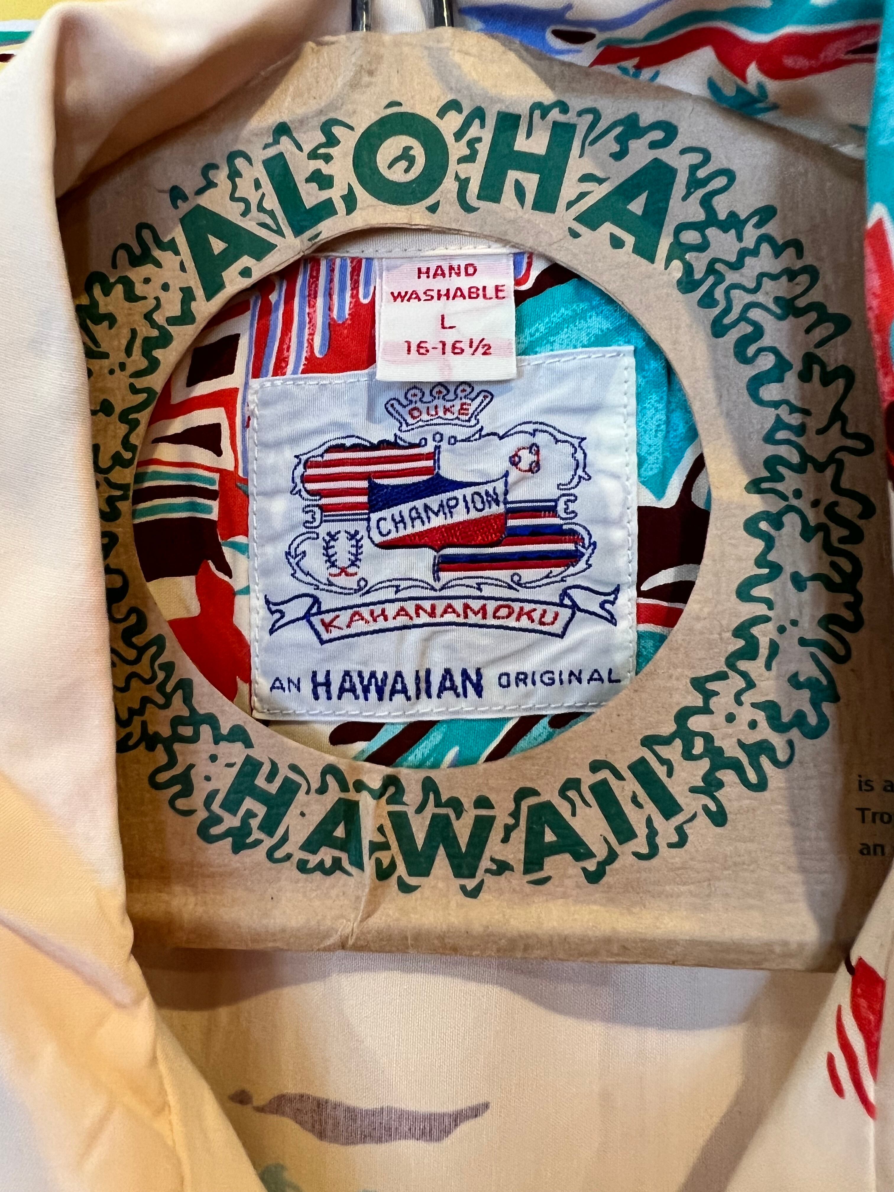 デューク・ブランドの代名詞ともいうべきレーヨンフジエット生地に、抜染としては多い7色もの色で柄が染め抜かれた希少価値の高い作品。カヌー、サーフィン、魚を獲っている漁師といった海にまつわる風景だけでなく、パイナップル畑やハレ(島民の家)などハワイの生活風景が多くのモチーフを使って描かれた贅沢な一枚となっている。