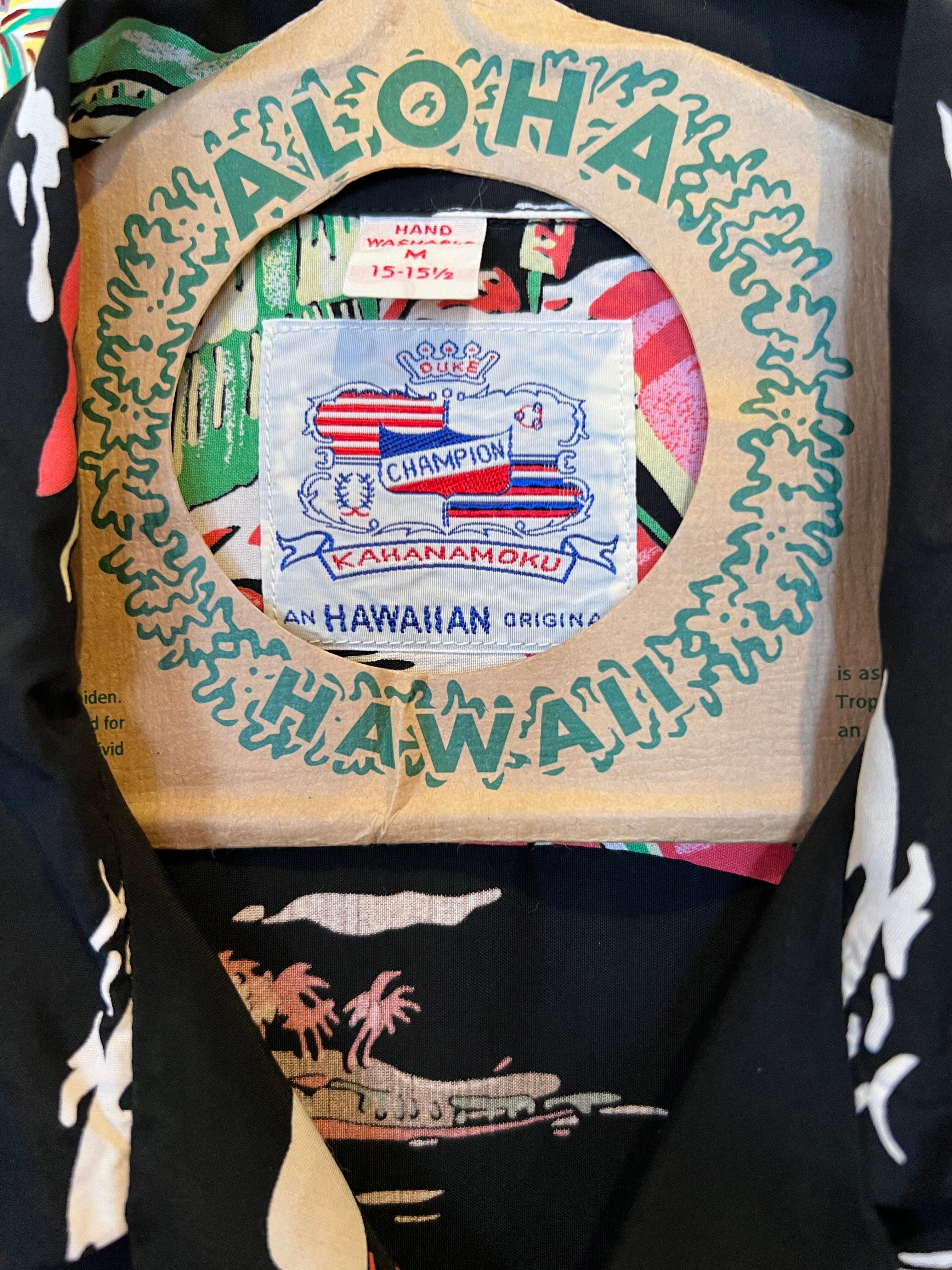 デューク・ブランドの代名詞ともいうべきレーヨンフジエット生地に、抜染としては多い7色もの色で柄が染め抜かれた希少価値の高い作品。カヌー、サーフィン、魚を獲っている漁師といった海にまつわる風景だけでなく、パイナップル畑やハレ(島民の家)などハワイの生活風景が多くのモチーフを使って描かれた贅沢な一枚となっている。