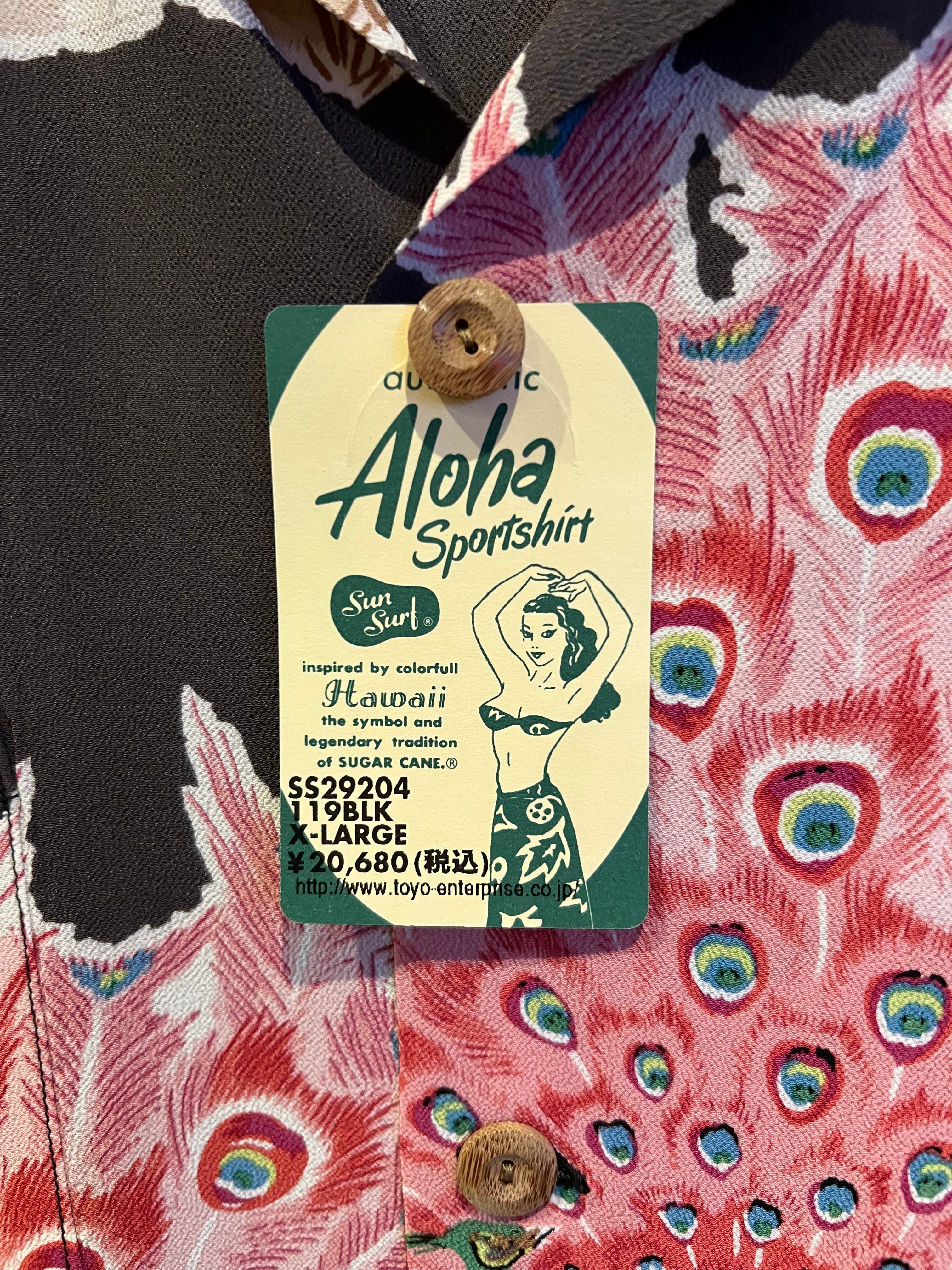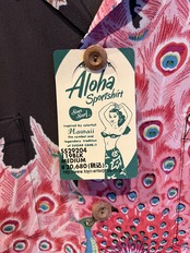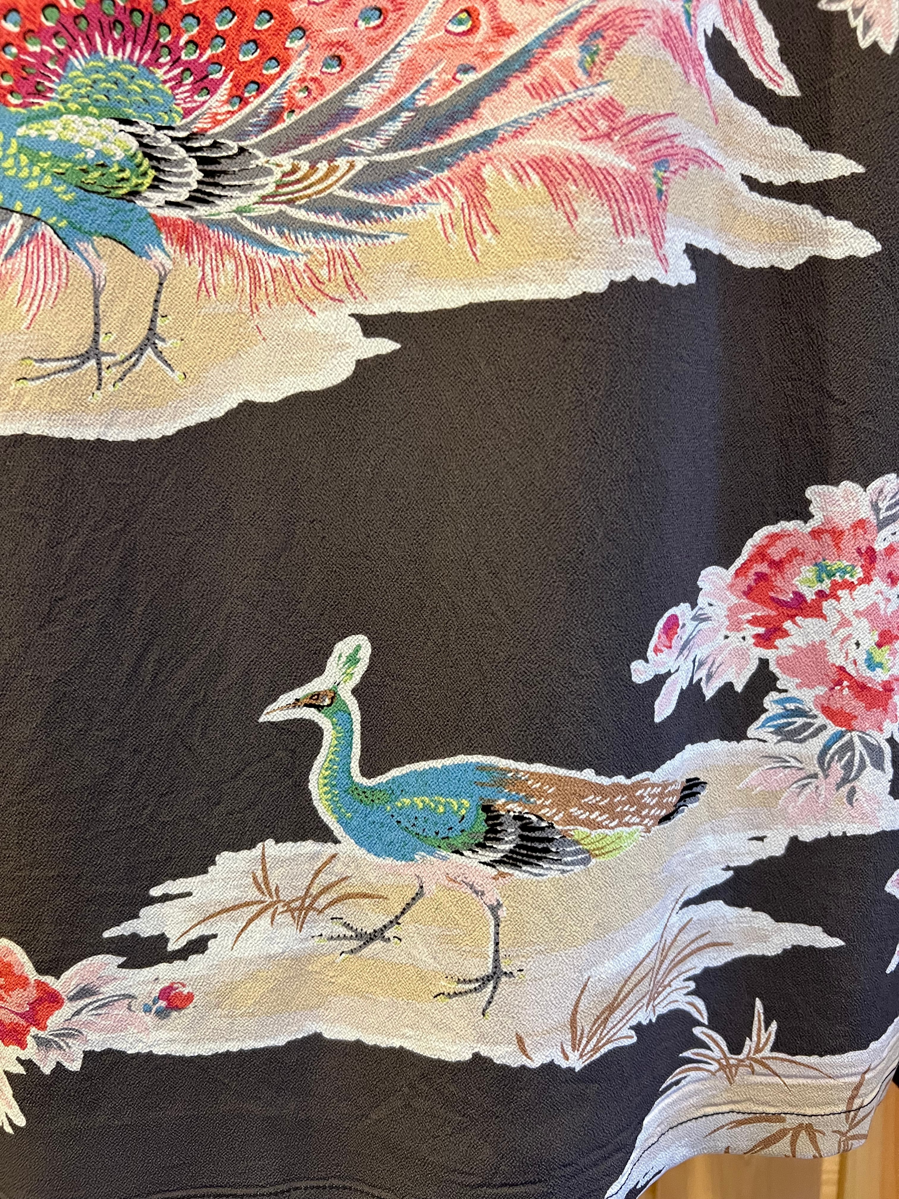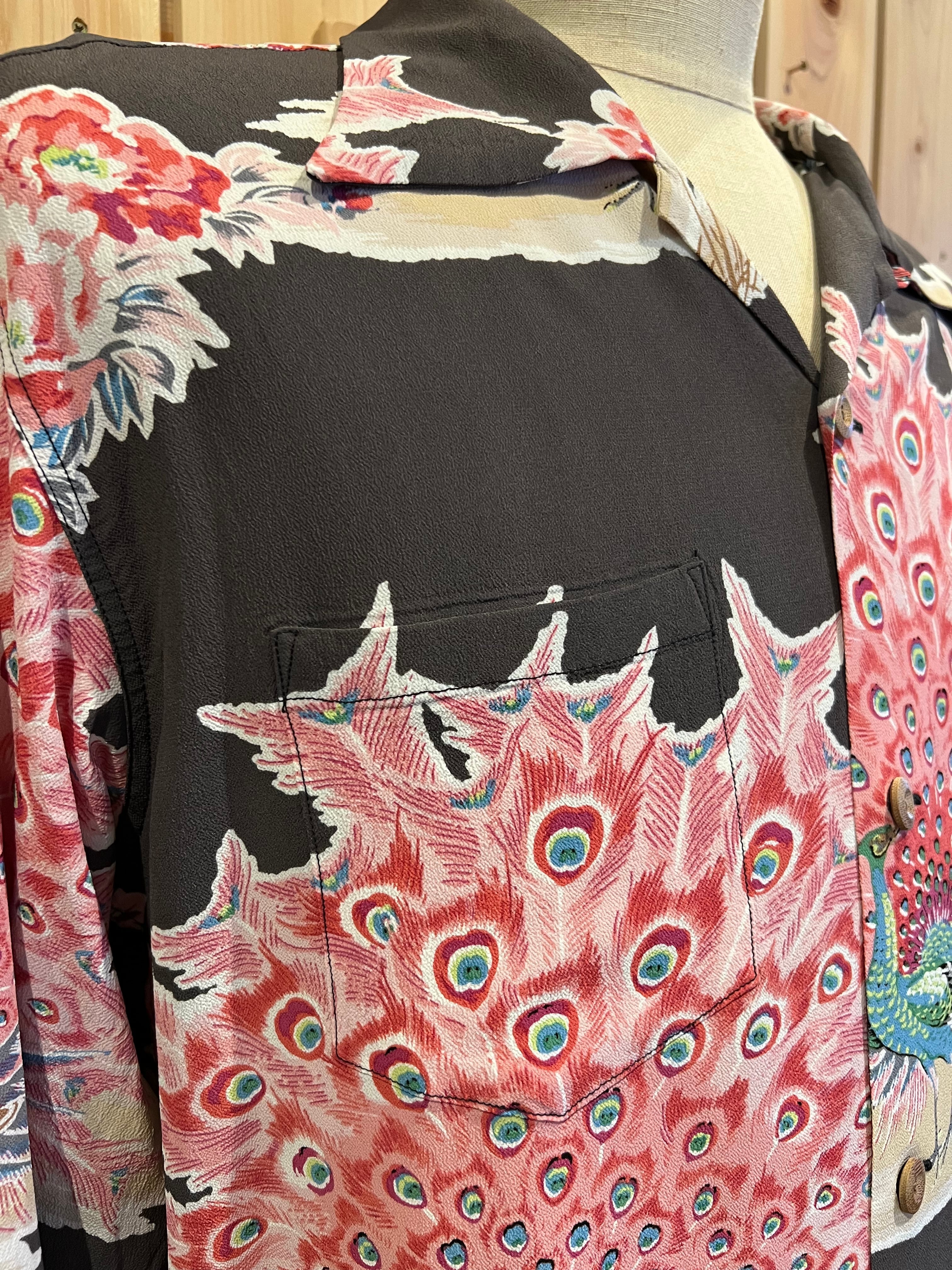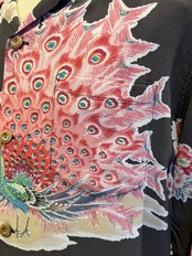 ハワイには孔雀に関わるものが多く存在する。その理由のひとつが、ハワイ王朝の最後の王位継承者となったカイウラニ王女が愛した鳥であったこと。彼女は叔母であるリリウオカラニ女王と共に、ハワイで絶大な人気を誇っていた。それ故、孔雀は特別な存在とされており、1950年代に生産されたアロハシャツのモチーフとしても人気であった。当時、ホノルルの高級紳士服店、ロス・サザーランドのために鐘淵紡績(カネボウ)でプリントされた作品。