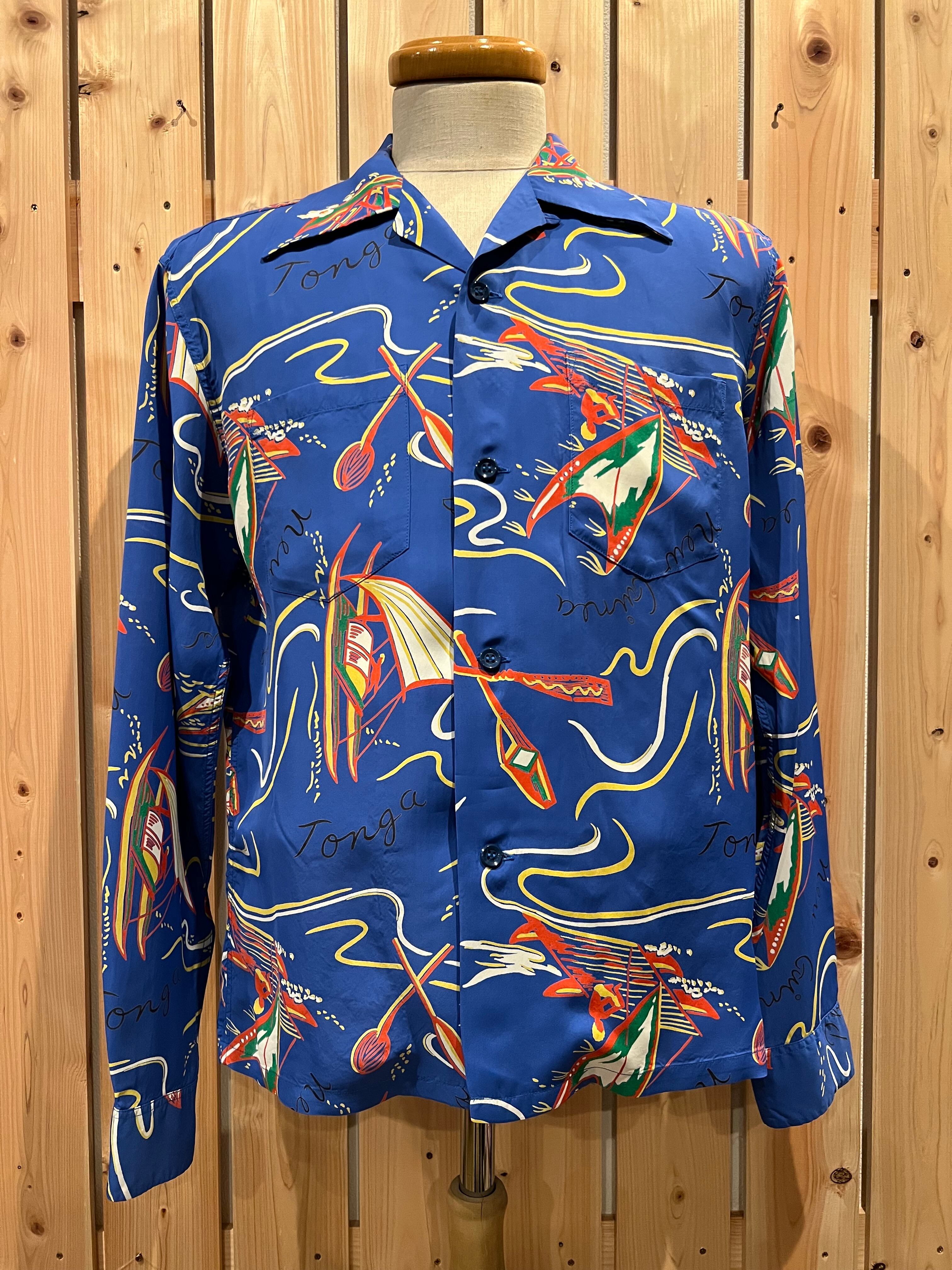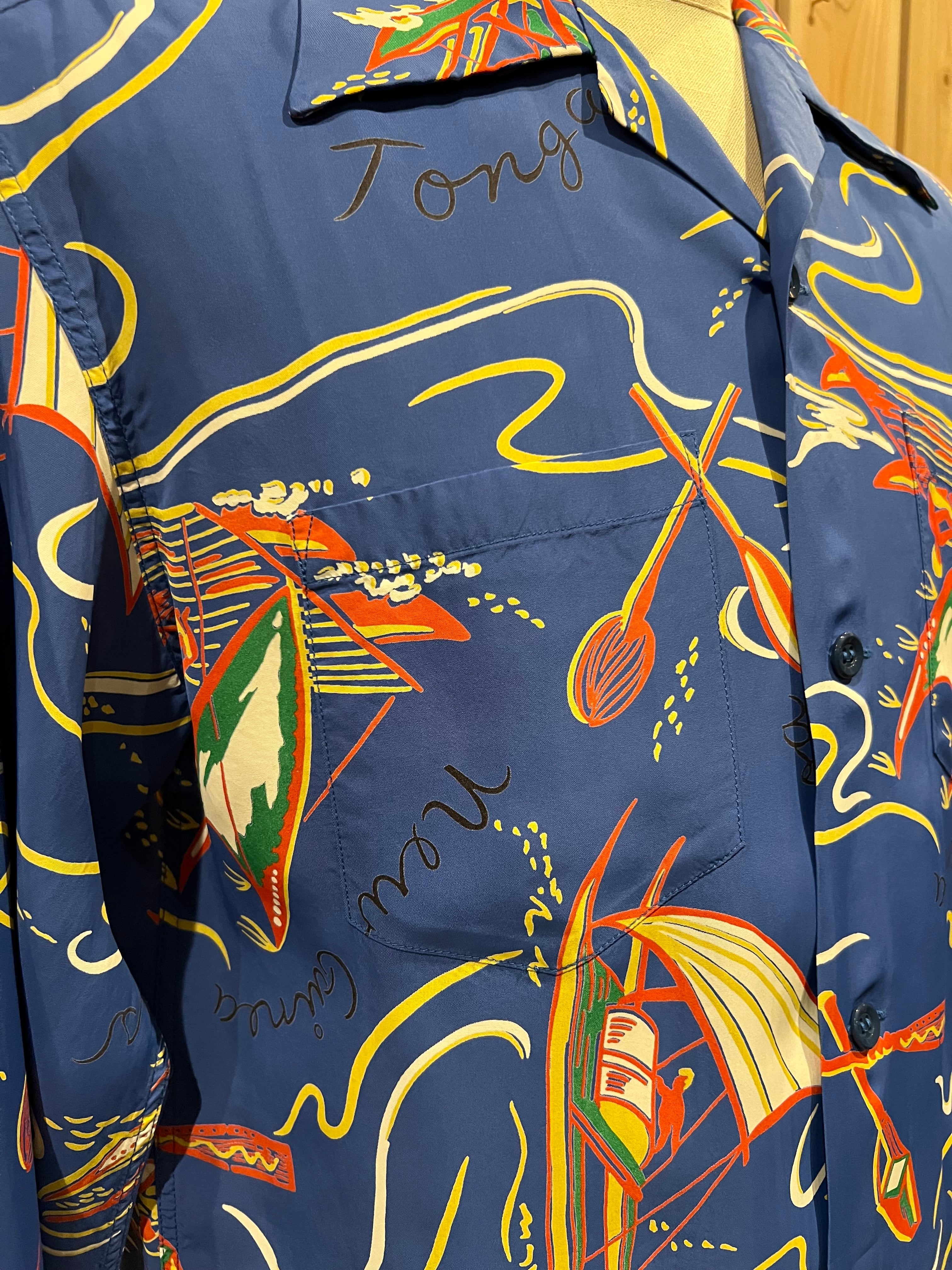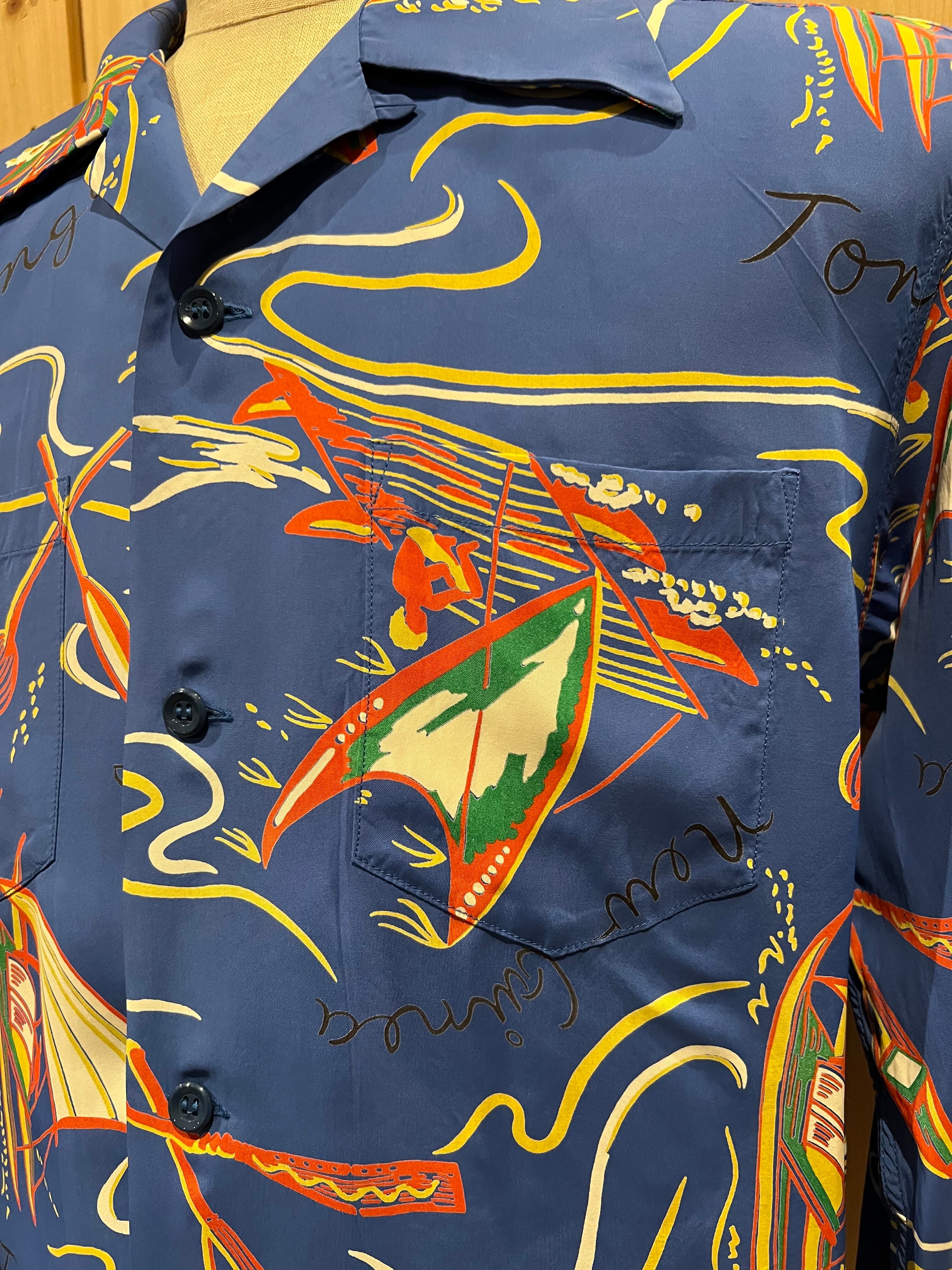 ネイティブ・ハワイアンの歴史のルーツにもなっているポリネシアン・カルチャー。その象徴ともいうべきカタマラン・カヌーと船を漕ぐパドルがメインのモチーフとなっている。手掛けたのはアロハシャツ史に名を残すテキスタイル・デザイナー、ジョン・メイグス。モチーフの間にはポリネシアの島々の名前が描かれ、その文化を愛し、自身もタヒチに移り住んだメイグスらしい一枚。彼の作品にはポリネシアの文化が色濃く現れたデザインも多い。