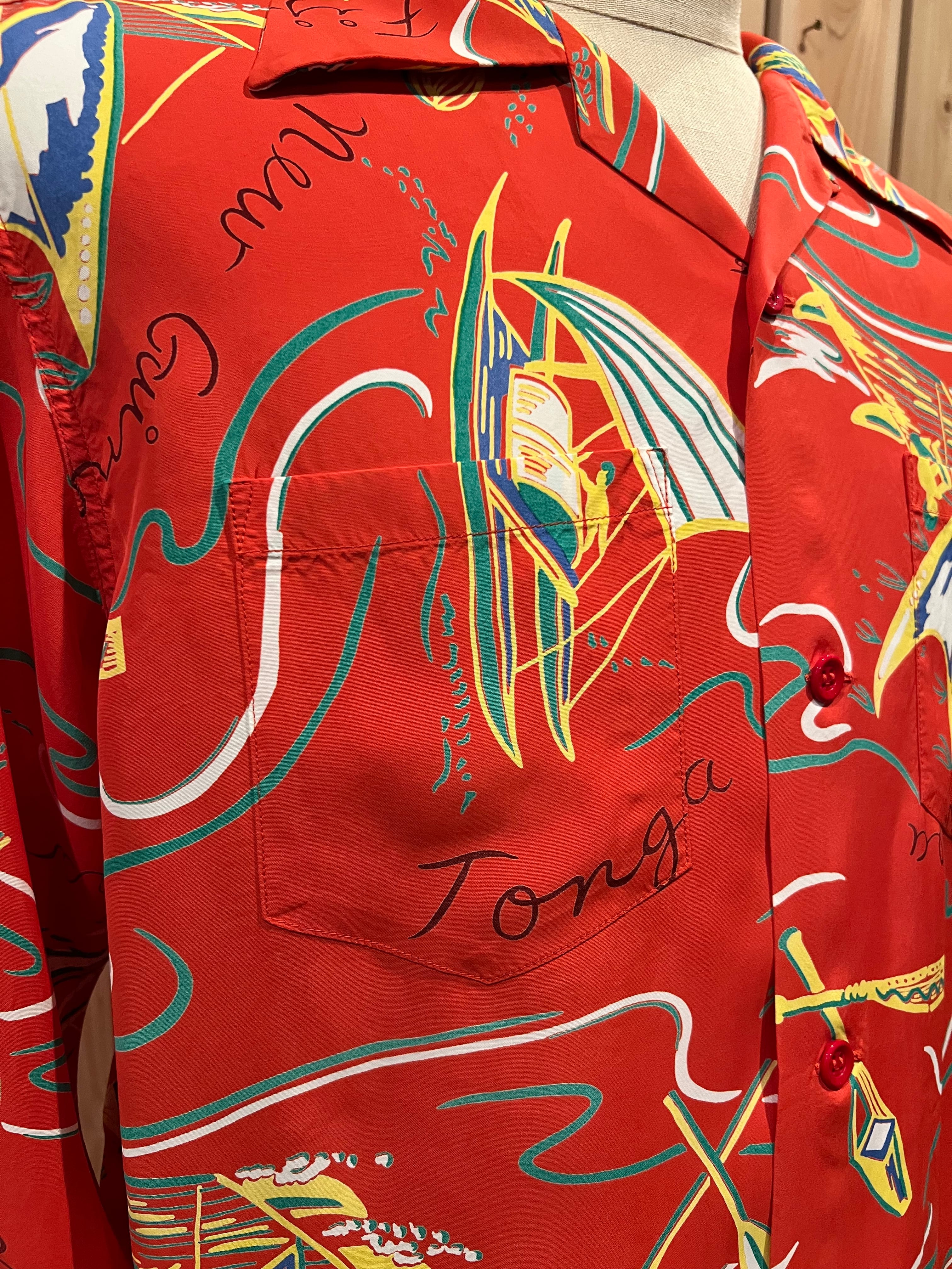 ネイティブ・ハワイアンの歴史のルーツにもなっているポリネシアン・カルチャー。その象徴ともいうべきカタマラン・カヌーと船を漕ぐパドルがメインのモチーフとなっている。手掛けたのはアロハシャツ史に名を残すテキスタイル・デザイナー、ジョン・メイグス。モチーフの間にはポリネシアの島々の名前が描かれ、その文化を愛し、自身もタヒチに移り住んだメイグスらしい一枚。彼の作品にはポリネシアの文化が色濃く現れたデザインも多い。