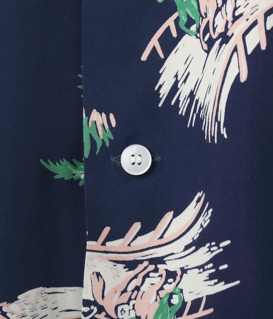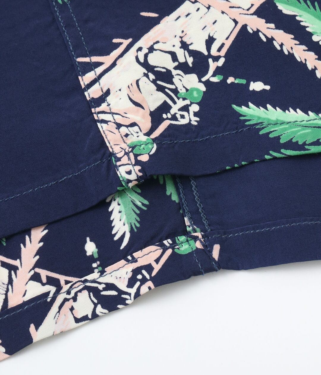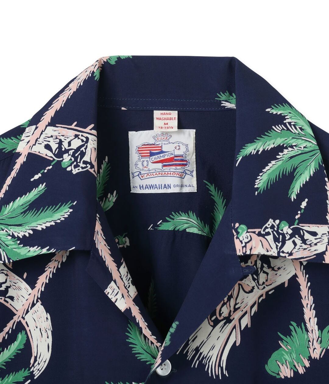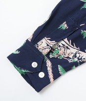 競走馬のレースの風景がモチーフとなった作品。数あるヴィンテージ・アロハシャツの中でも馬や競馬を題材にしたデザインは非常に少なく、コレクターからの人気も高い。リゾート地としても人気であったフロリダ州マイアミは、当時のアロハシャツの重要な販売拠点。‘30年代から競馬が盛んに行われていたこの地のシンボルとして、シャツのデザインに採用され、販売されていた歴史がわかる一枚。