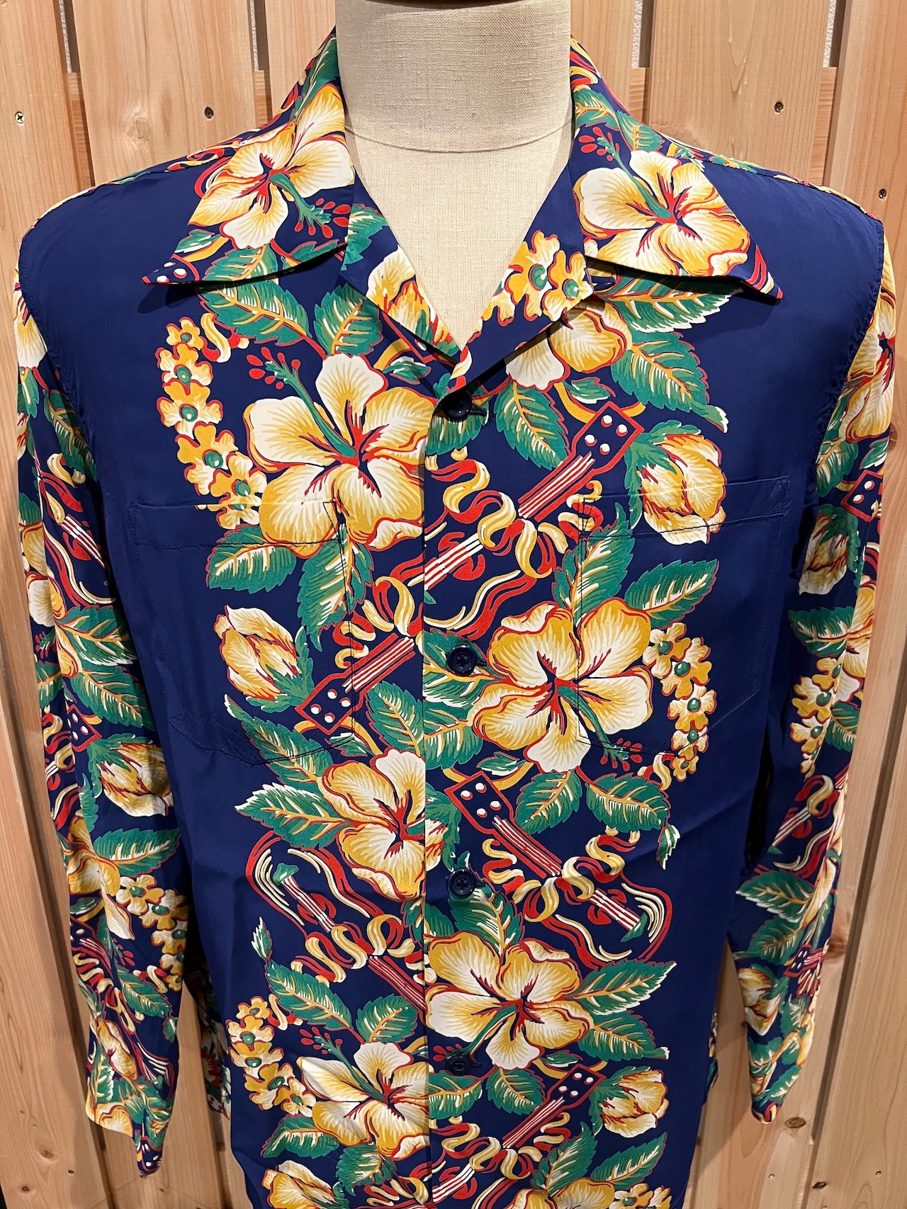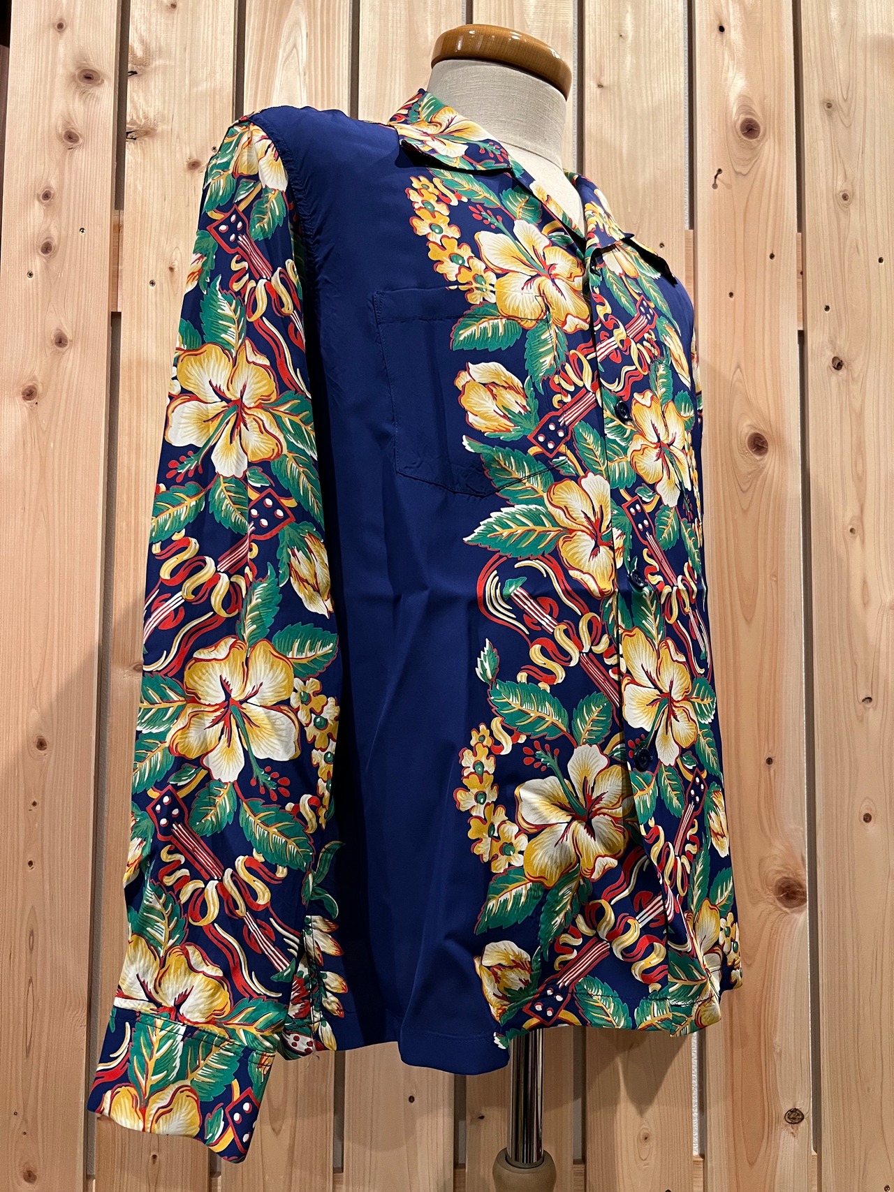 ハワイの象徴ともいえるレイ、ウクレレ、ハイビスカスをメインモチーフに、ボーダー・パターンを構成した人気のデザイン。アロハシャツの柄としても採用される頻度の高いそれらのモチーフが 6色の抜染の手法により、互いが引き立てられるよう表現されている。また、描かれている図柄の大きさやレイアウトのバランスなど、デザインとしての完成度も高い。コレクターからの支持も厚く、ヴィンテージ・アロハシャツを扱う書籍にも掲載されている。