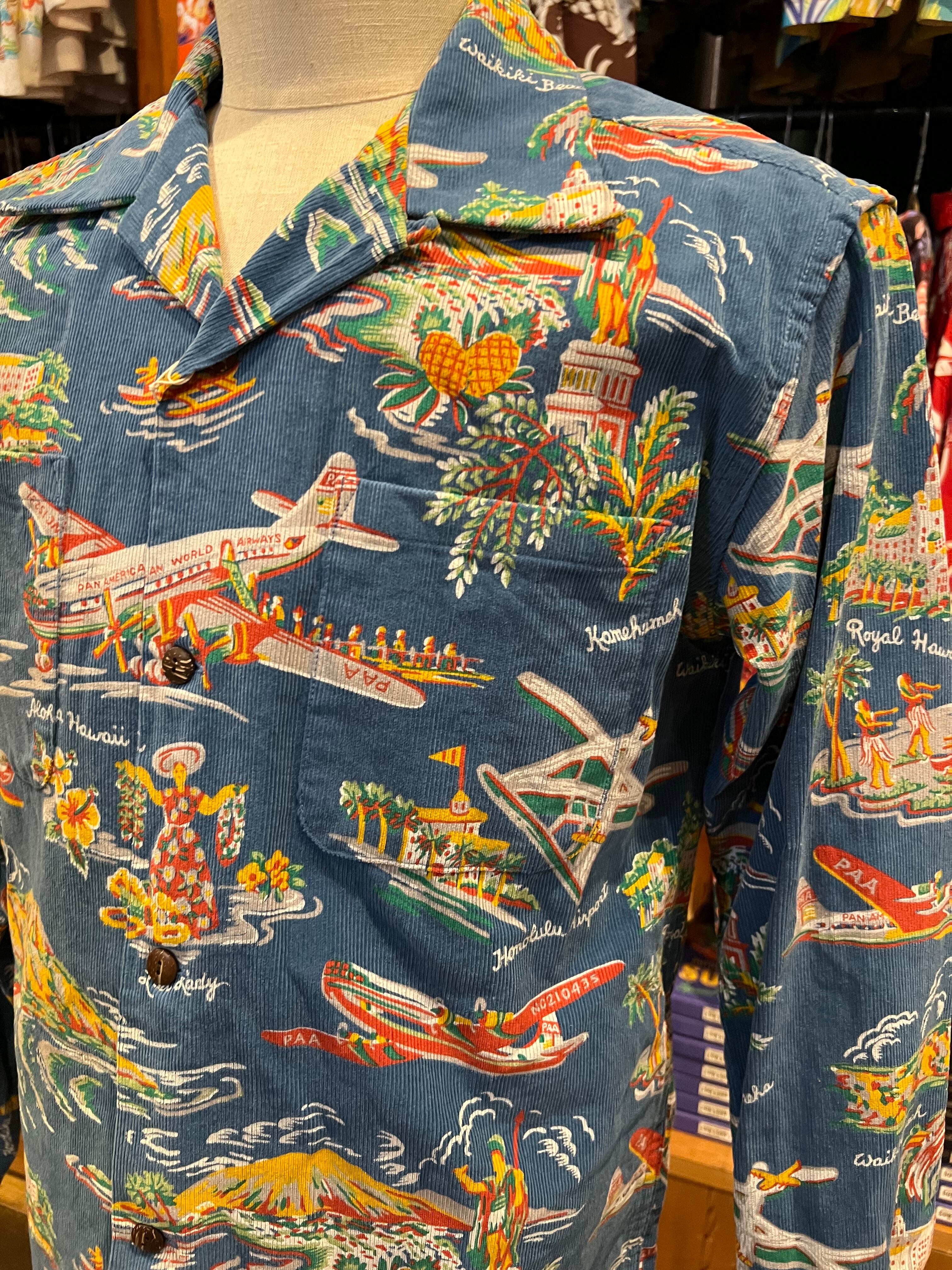 PAA AIR TRAVELモチーフの有名なデザインをレーヨンからコーデュロイにアレンジしました、ボタンにはココナッツボタンを使用。