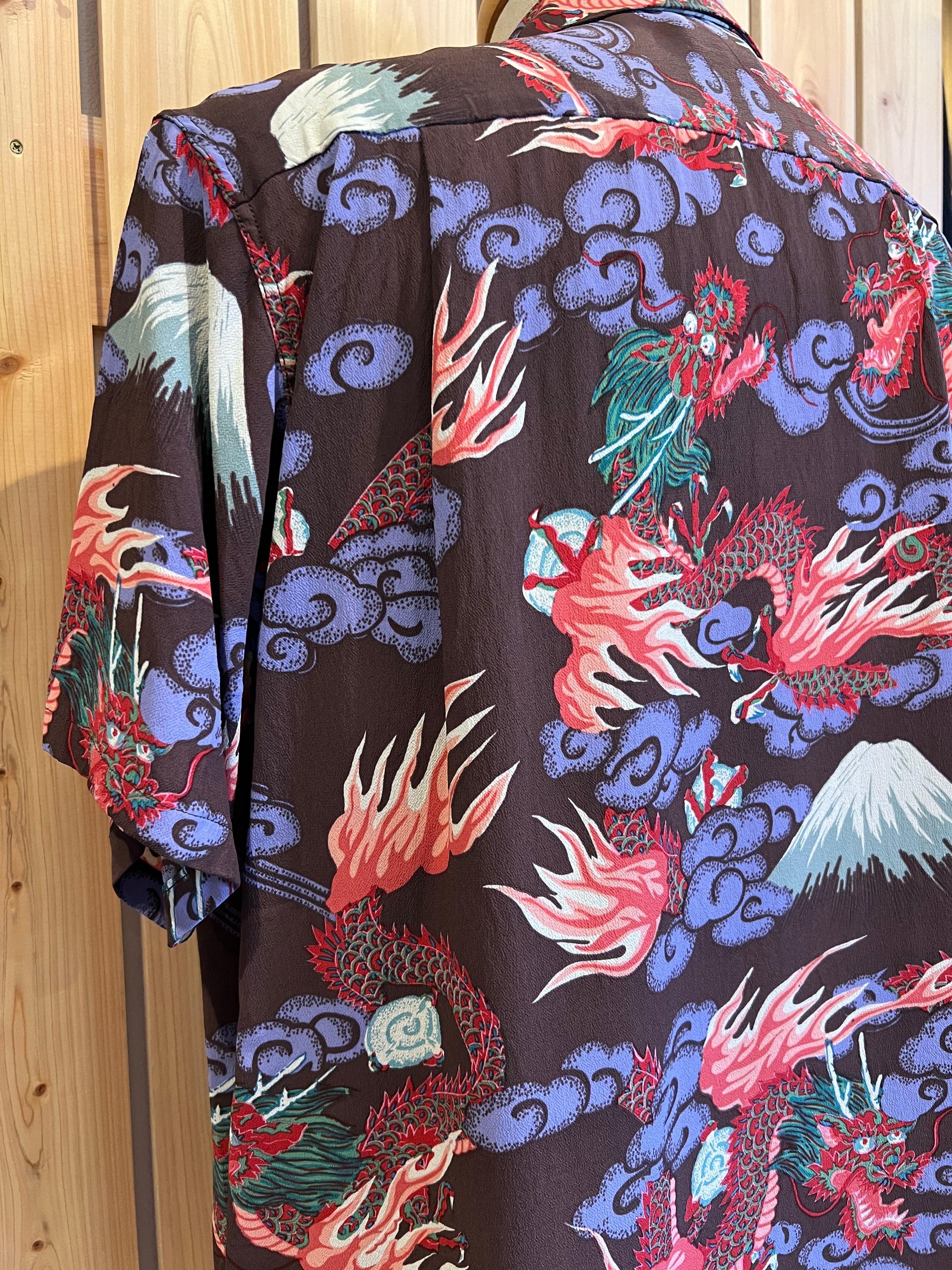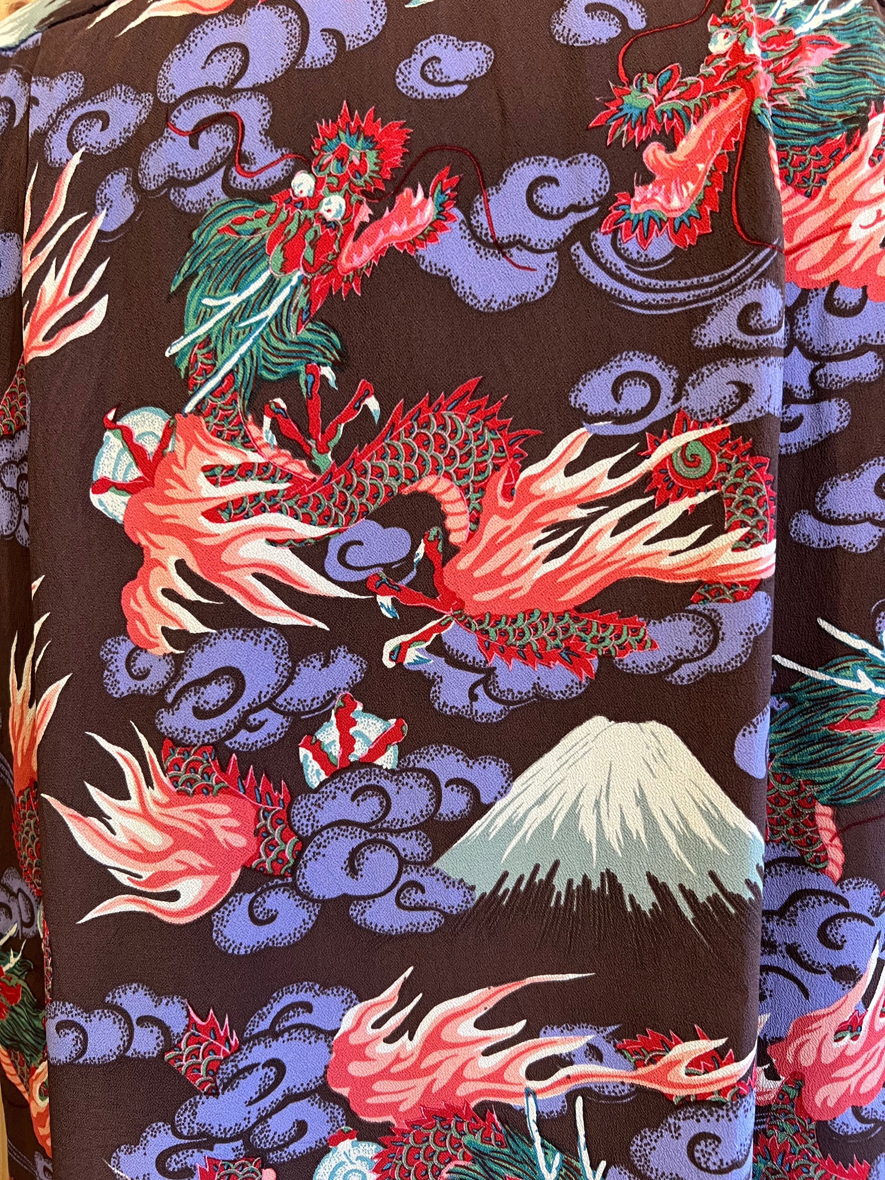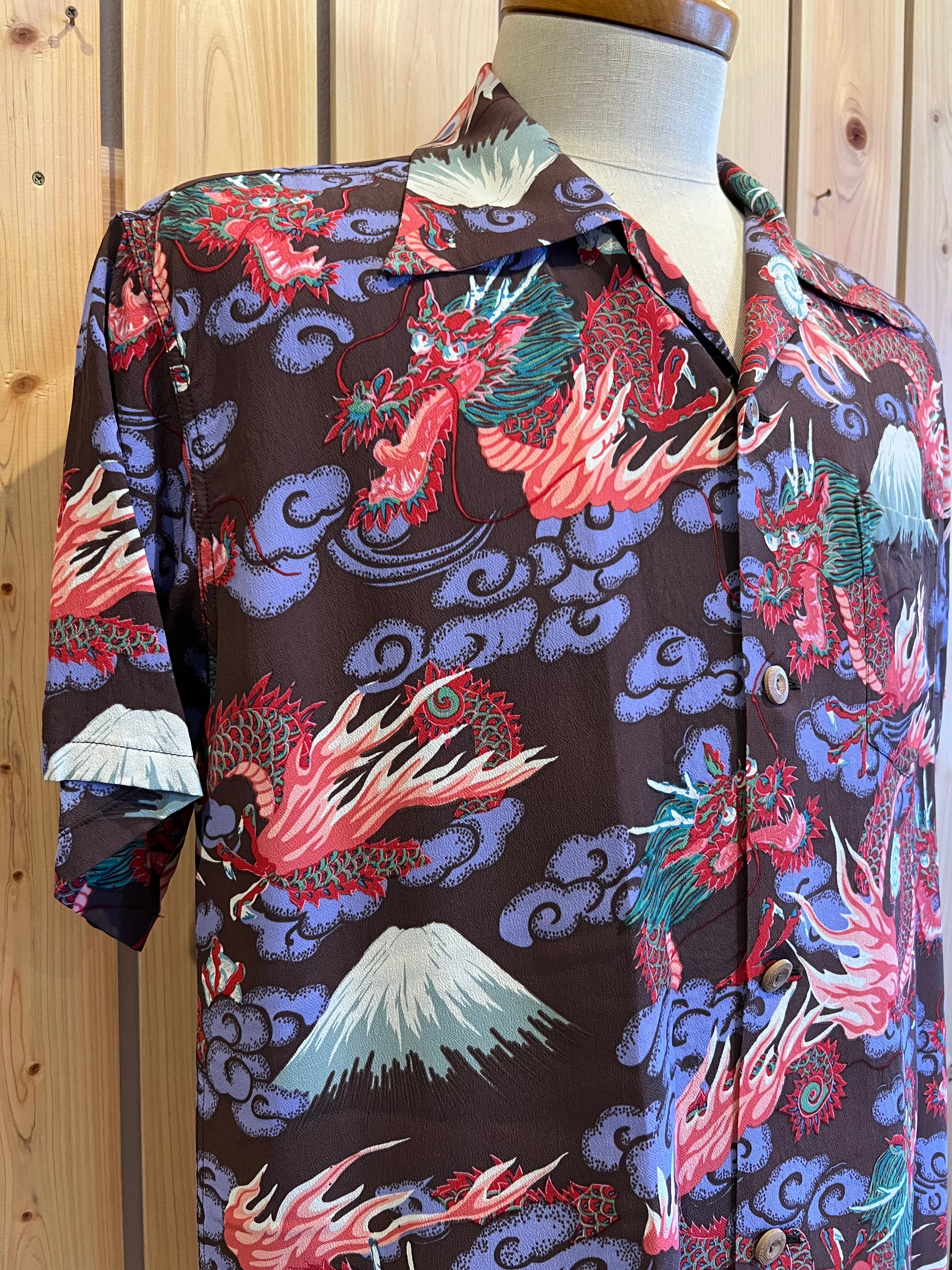 1950年代後半に入ると、アロハシャツやボウリングシャツの生産の多くを日本の工場が請け負うようになっていた。それに伴い、北関東に工場を持っていた会社なども新たに横浜で縫製工場をスタートさせ、港から多くのシャツがハワイへと送られた。この作品も大手商社であった東光貿易が横浜で展開していたブランド、サンブロス&カンパニーが手掛けた一枚。富士山をバックに何頭もの龍が雲の合間から顔を覗かせる珍しいデザイン。