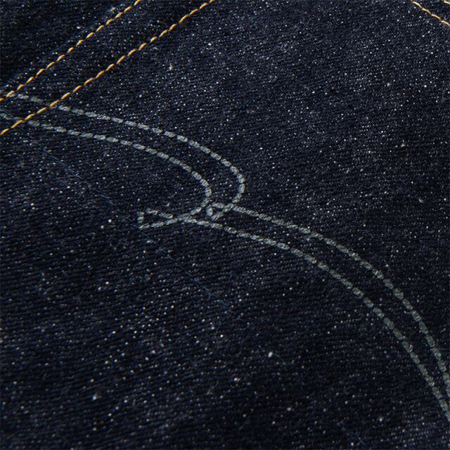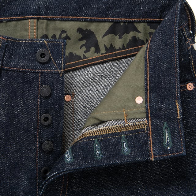 簡素化されたディテールや幅広のベルトループ、不格好な縫製具合などを再現し、デニムはゴジラの皮膚をイメージしたムラ感と凹凸のある18ozのヘヴィーオンスデニムを使用。