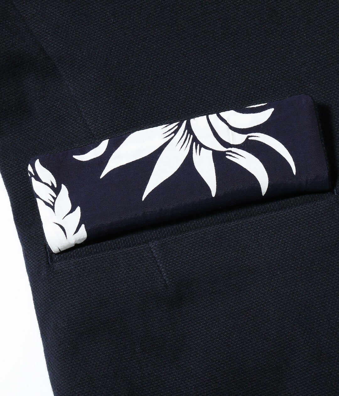 取り外し可能なライニングには、デューク・カハナモクでお馴染みのパイナップルがプリントされたレーヨンフジエット素材の生地を使用ポケットには同柄のチーフが収納されており、TPOに合わせて使用可能 袖の内側にもレーヨン素材を使い、滑らかな肌触りで袖通しが良く、着心地を重視した作りで季節を問わず楽しめるアイテムとなっています。