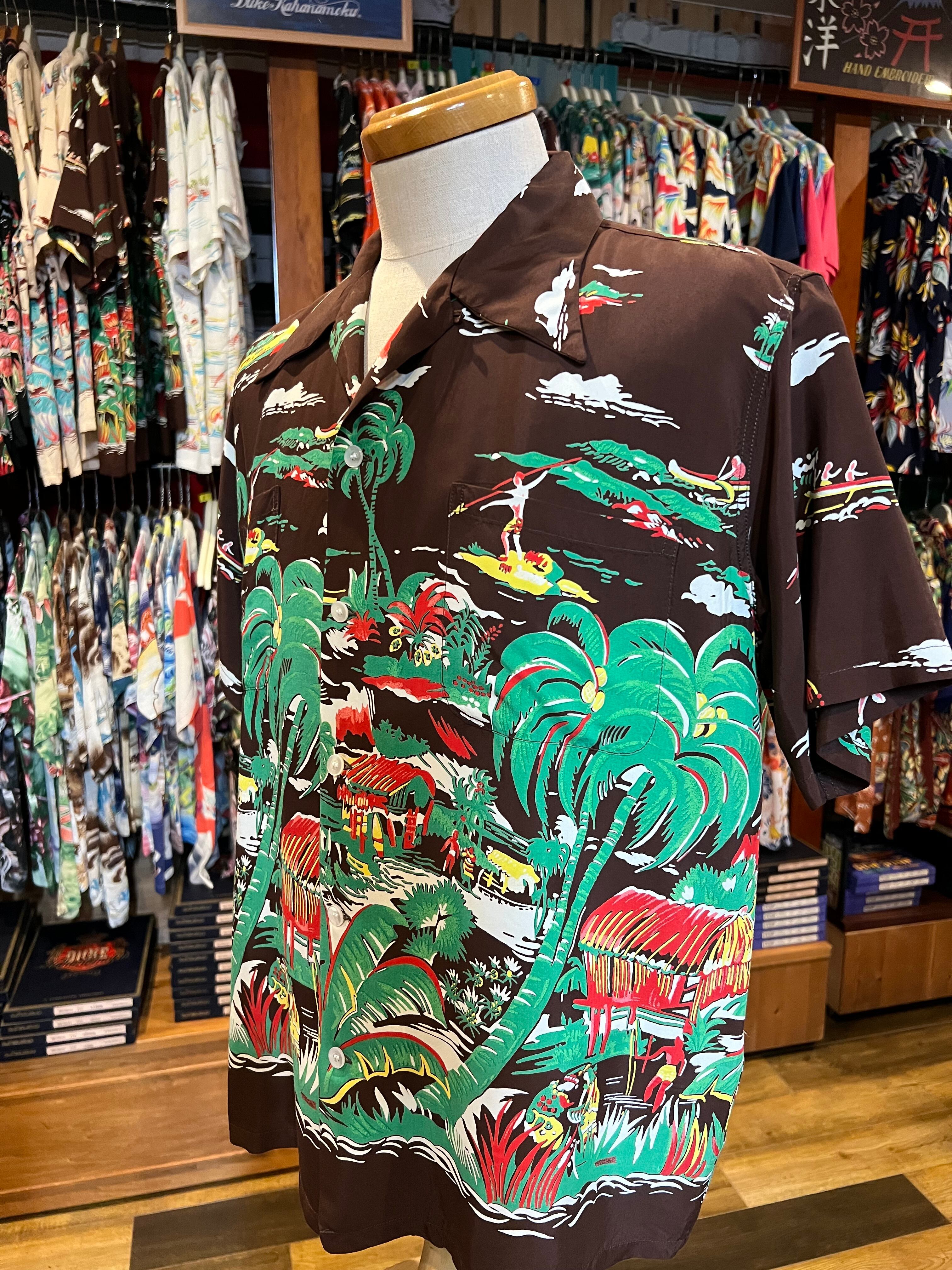 デューク・ブランドの代名詞ともいうべきレーヨンフジエット生地に、抜染としては多い7色もの色で柄が染め抜かれた希少価値の高い作品。カヌー、サーフィン、魚を獲っている漁師といった海にまつわる風景だけでなく、パイナップル畑やハレ(島民の家)などハワイの生活風景が多くのモチーフを使って描かれた贅沢な一枚となっている。